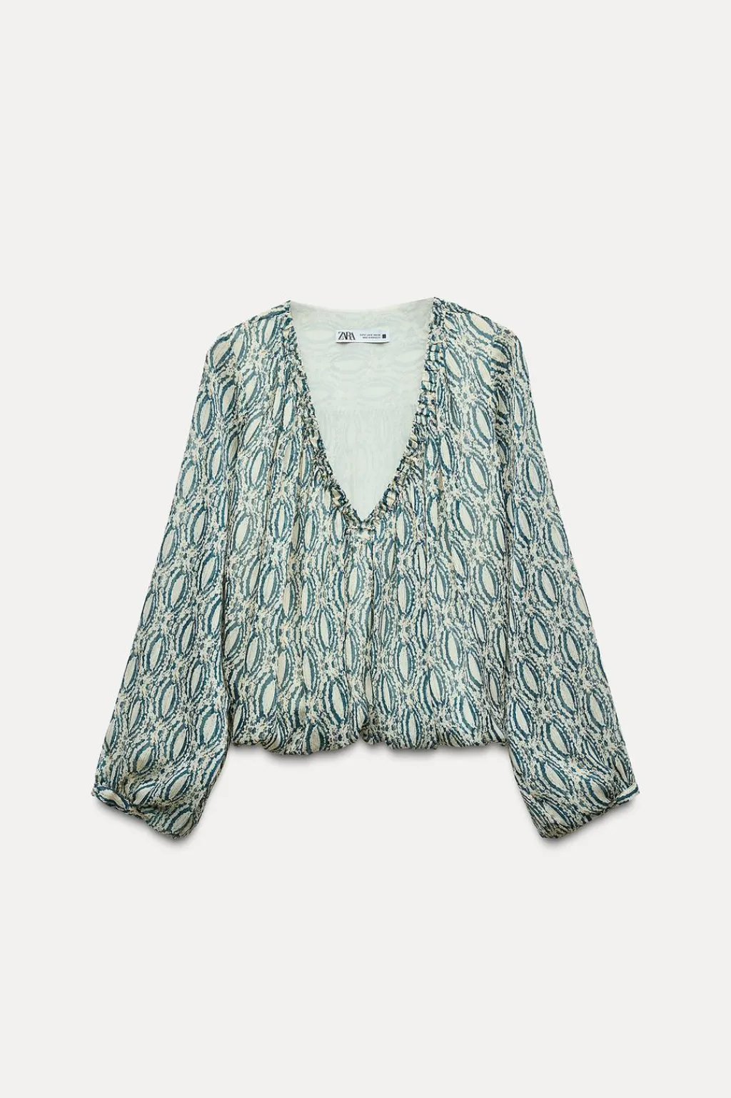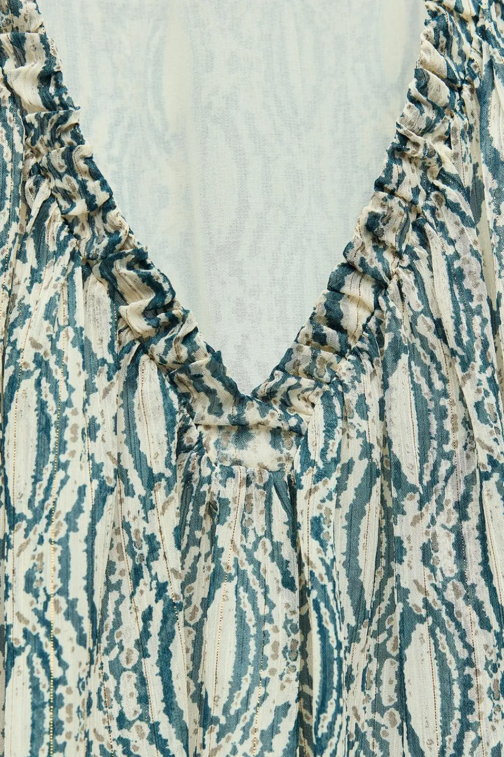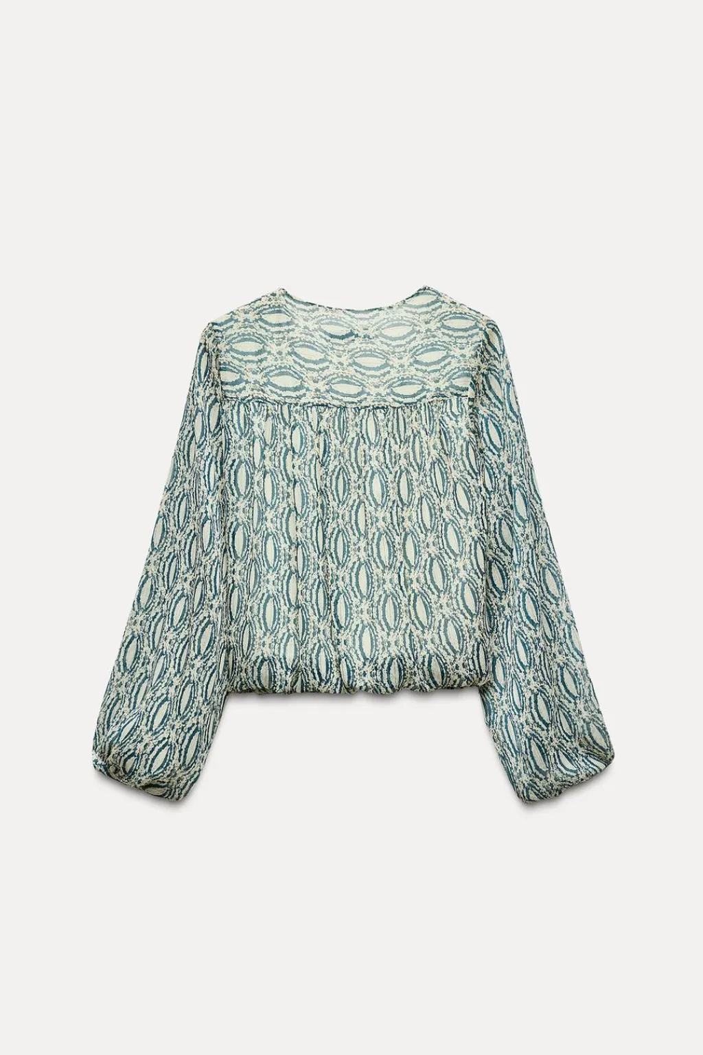 Cuerpo de escote pico con frunces y manga larga. Detalle de tejido con hilo metalizado. Bajo abullonado con elástico interior.