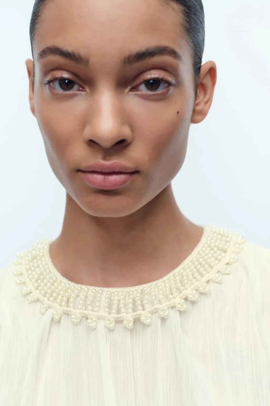 Cuerpo de cuello redondo con perlas y manga larga. Detalle de tejido efecto arrugado. Cierre en espalda con abertura y botón oculto.