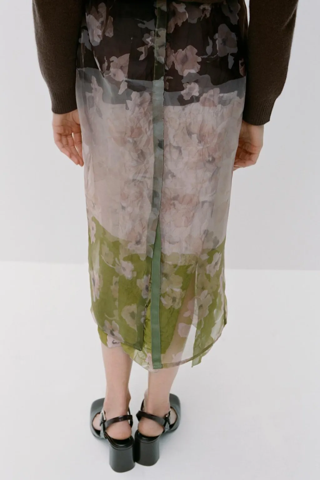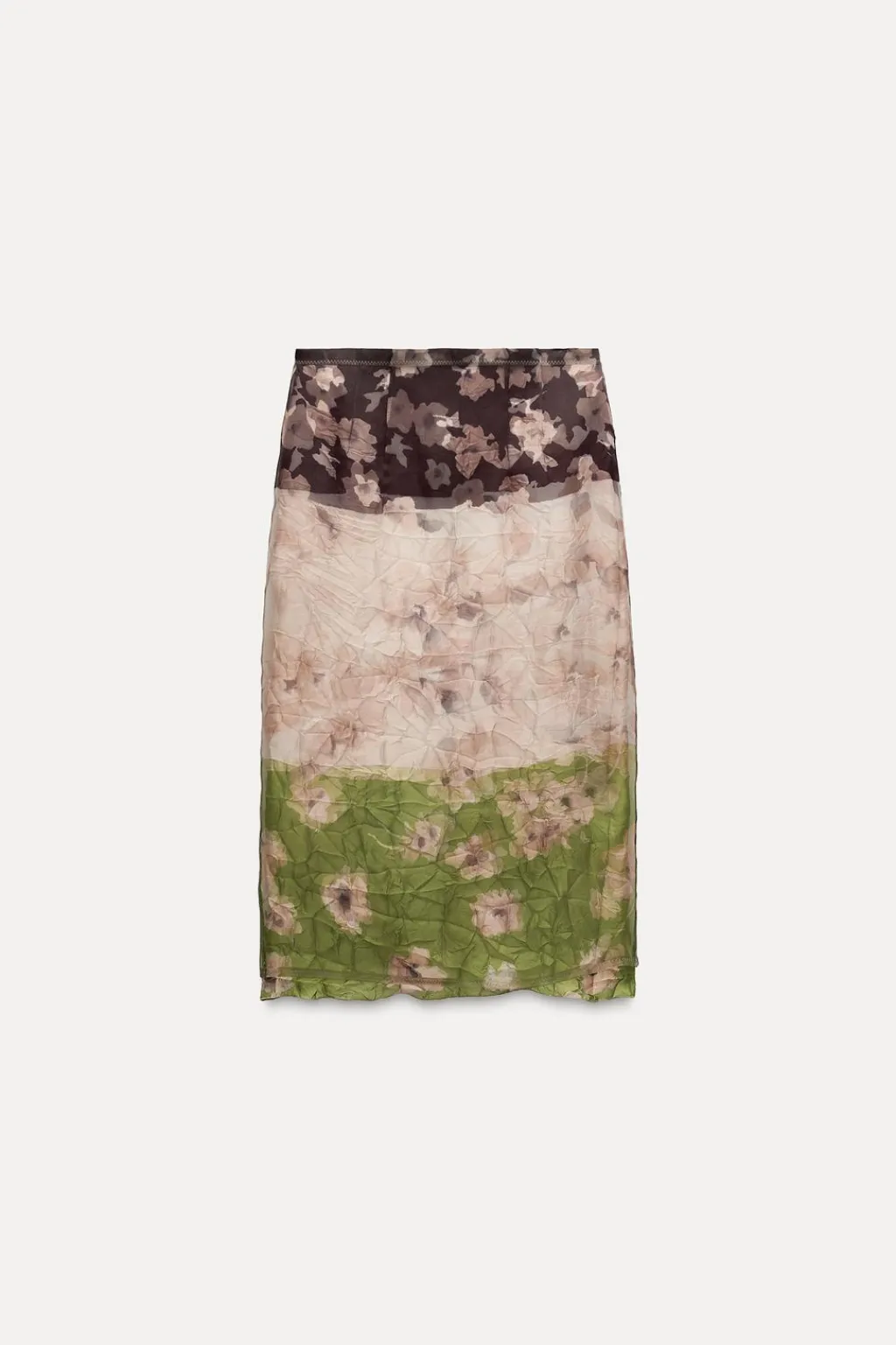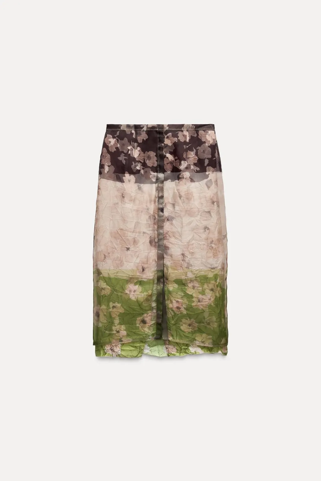 Falda midi de tiro medio confeccionada en tejido tipo organza. Detalle de estampación a contraste. Bajo asimétrico con abertura. Forro interior. Cierre con cremallera oculta en costura.