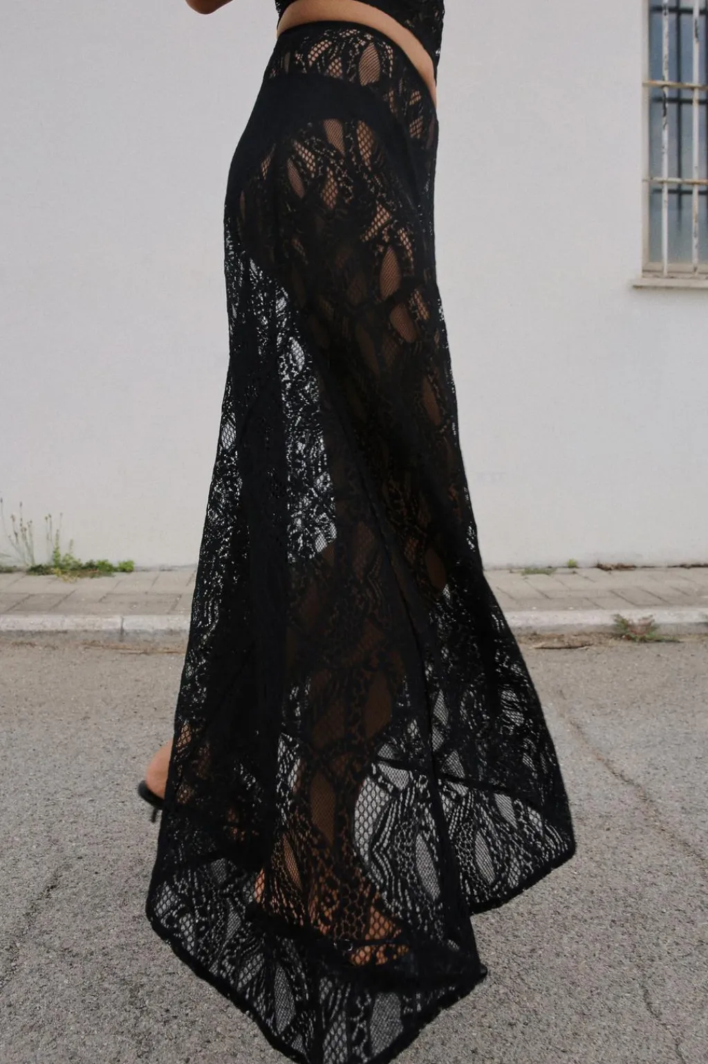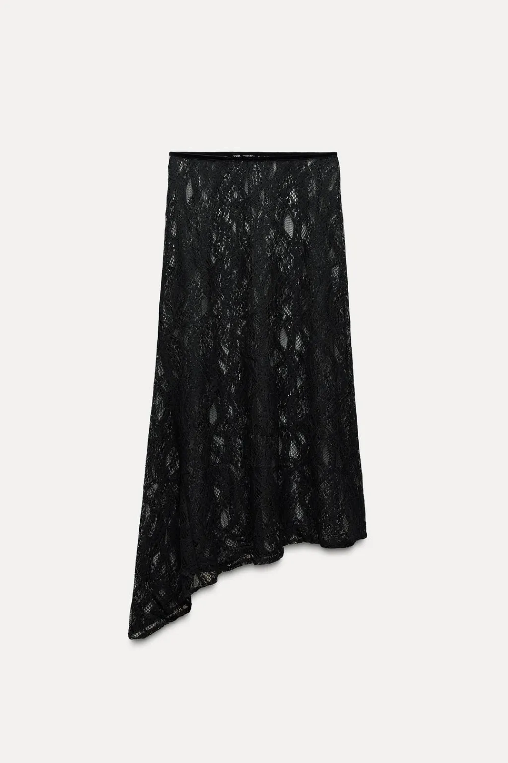 Falda midi confeccionada en tejido tipo encaje. Tiro medio y cintura con elástico. Bajo asimétrico.