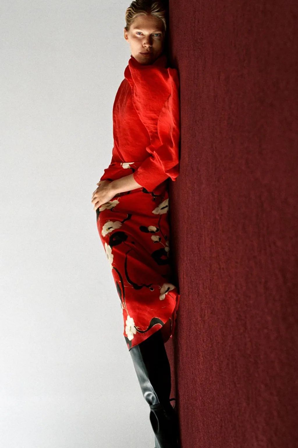 Falda midi de tiro medio confeccionada en hilatura de viscosa 100%. Detalle de estampación floral a contraste. Bajo acabado en línea evasé.