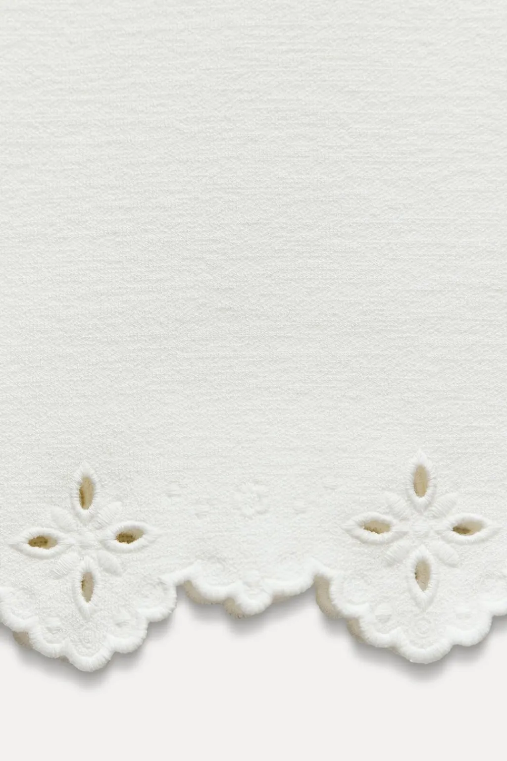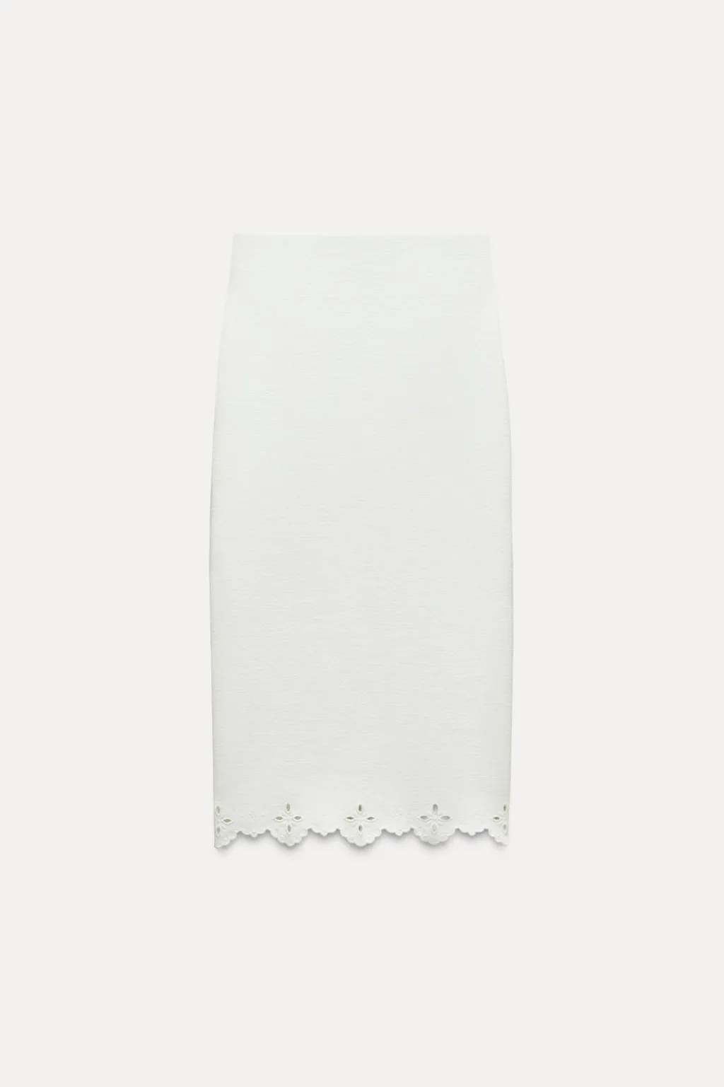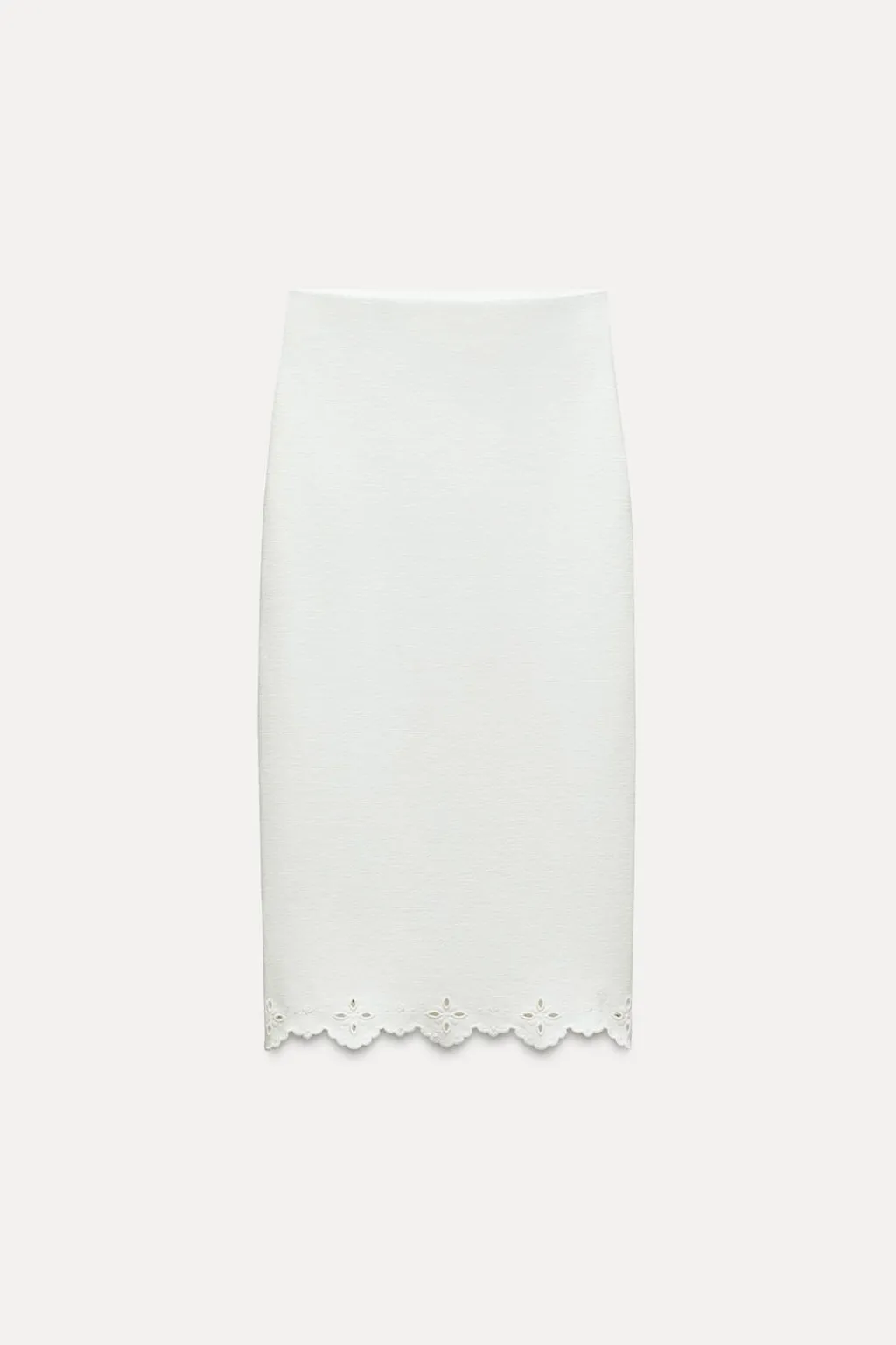 Falda midi entallada confeccionada en tejido tipo punto. Tiro alto y cintura con elástico interior. Bajo acabado en ondas con bordados perforados.