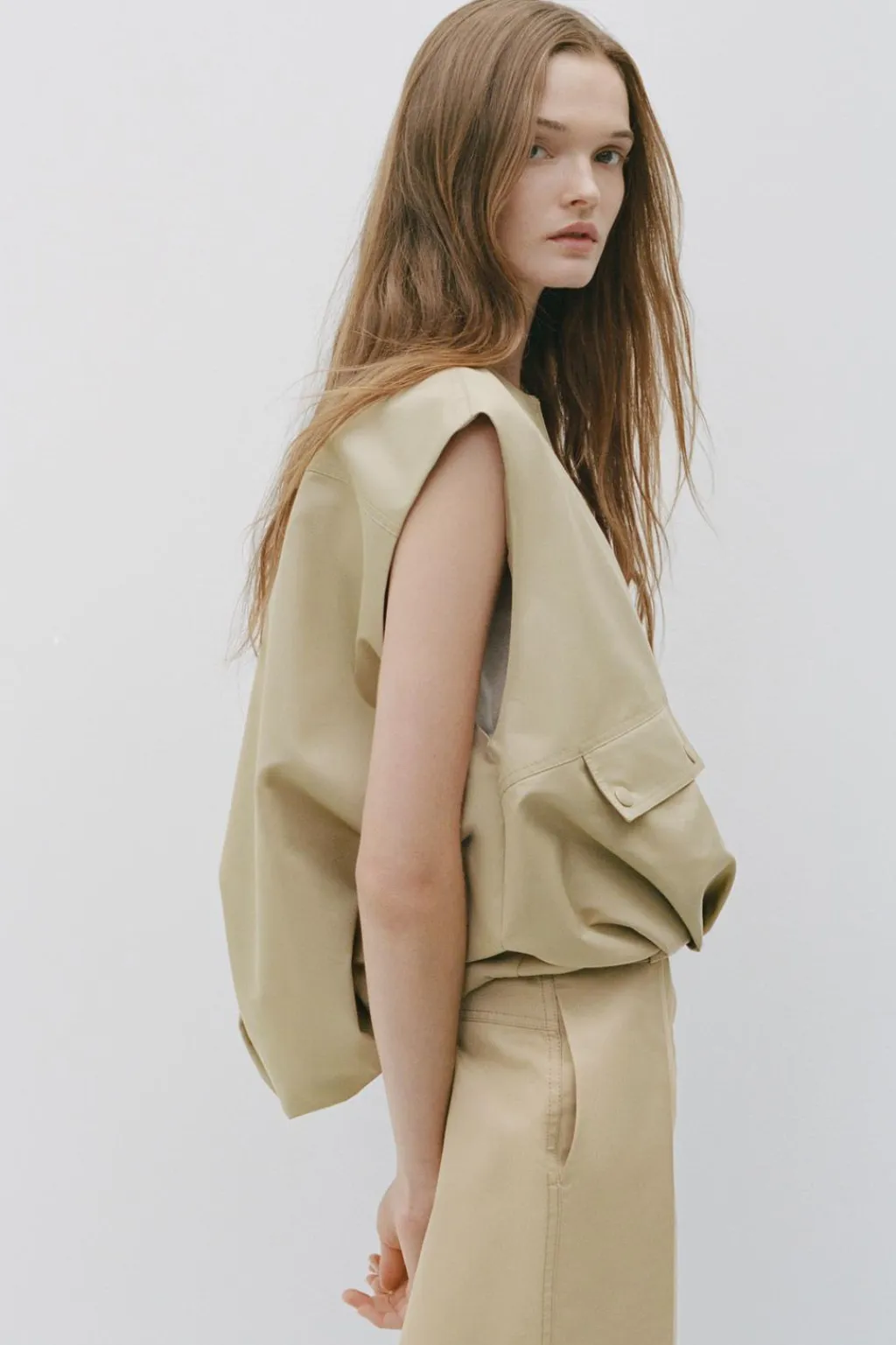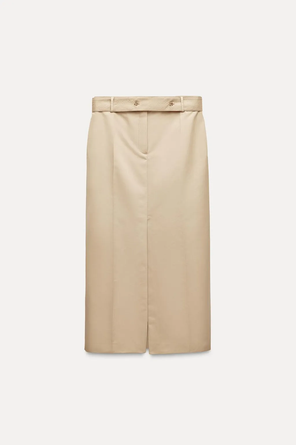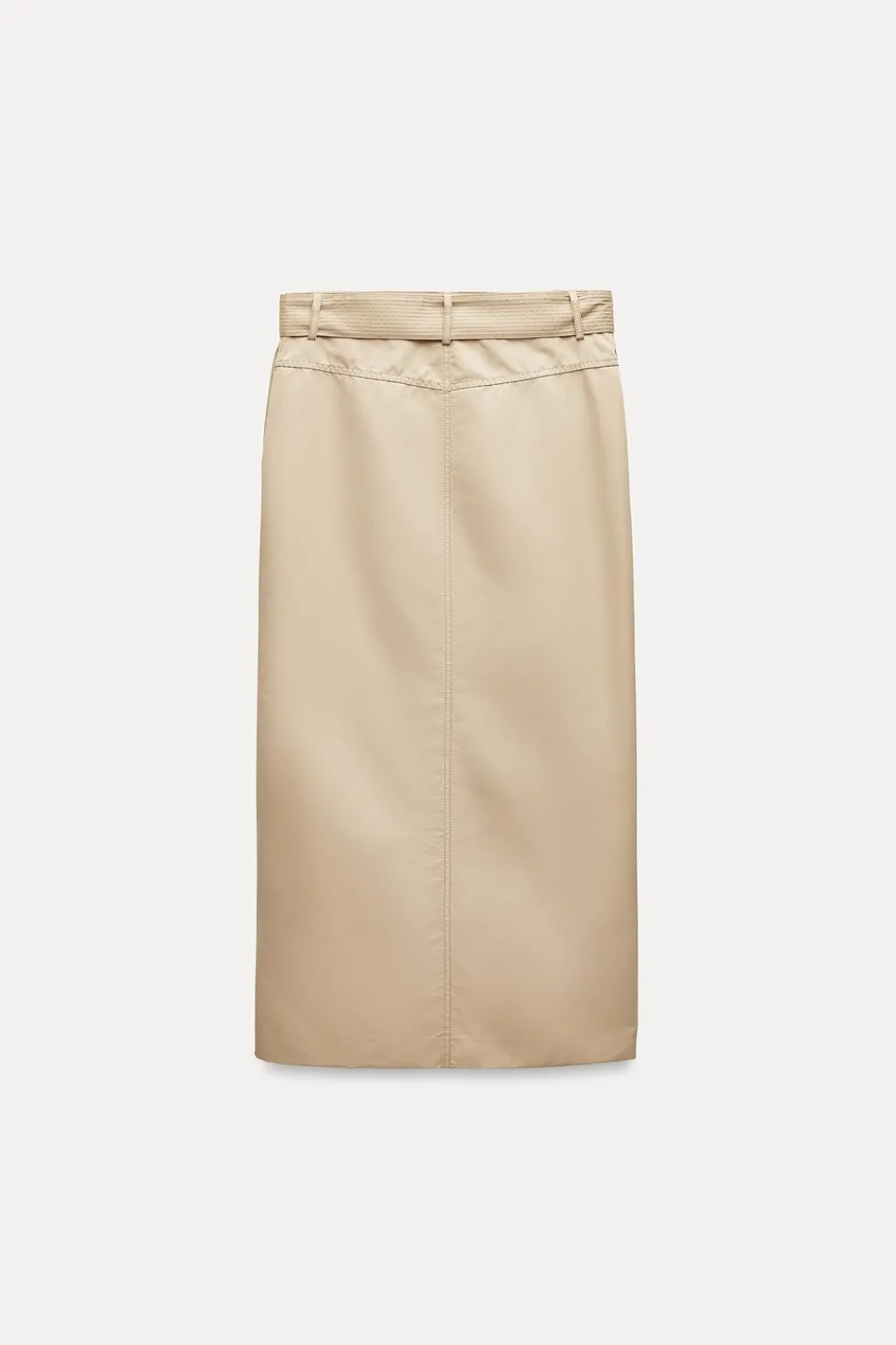 Falda midi confeccionada en tejido tipo gabardina. Tiro medio y cintura con trabillas. Cinturón en mismo tejido ajustable con botones. Bolsillos laterales ocultos en costura. Bajo acabado en abertura. Cierre frontal con cremallera y botón.