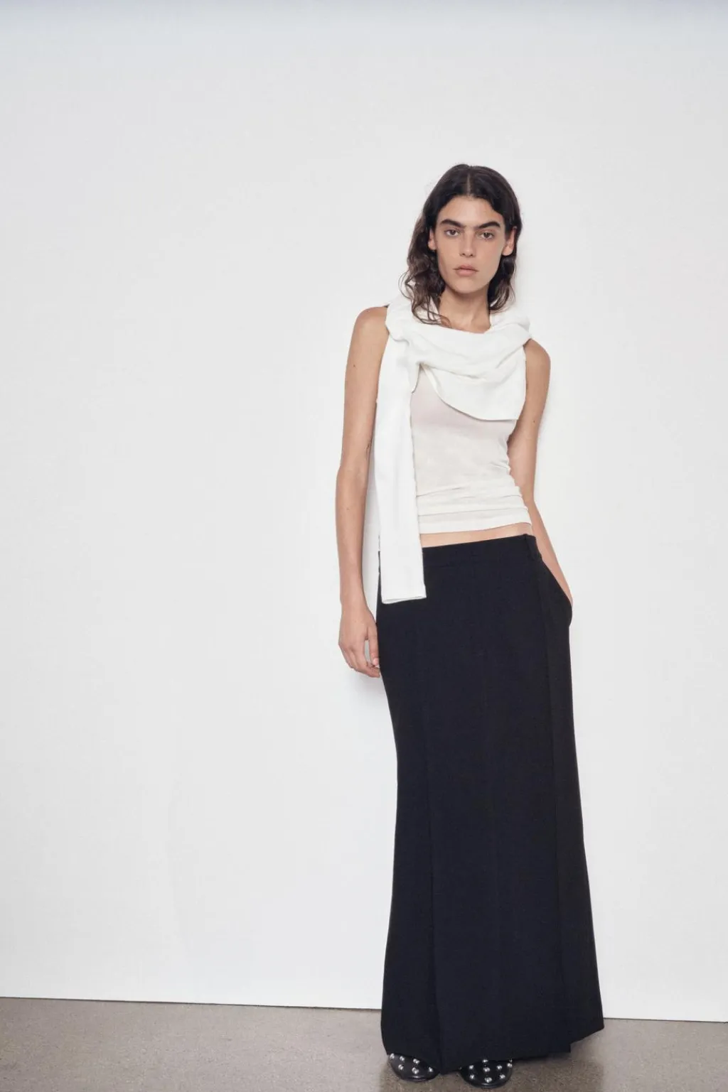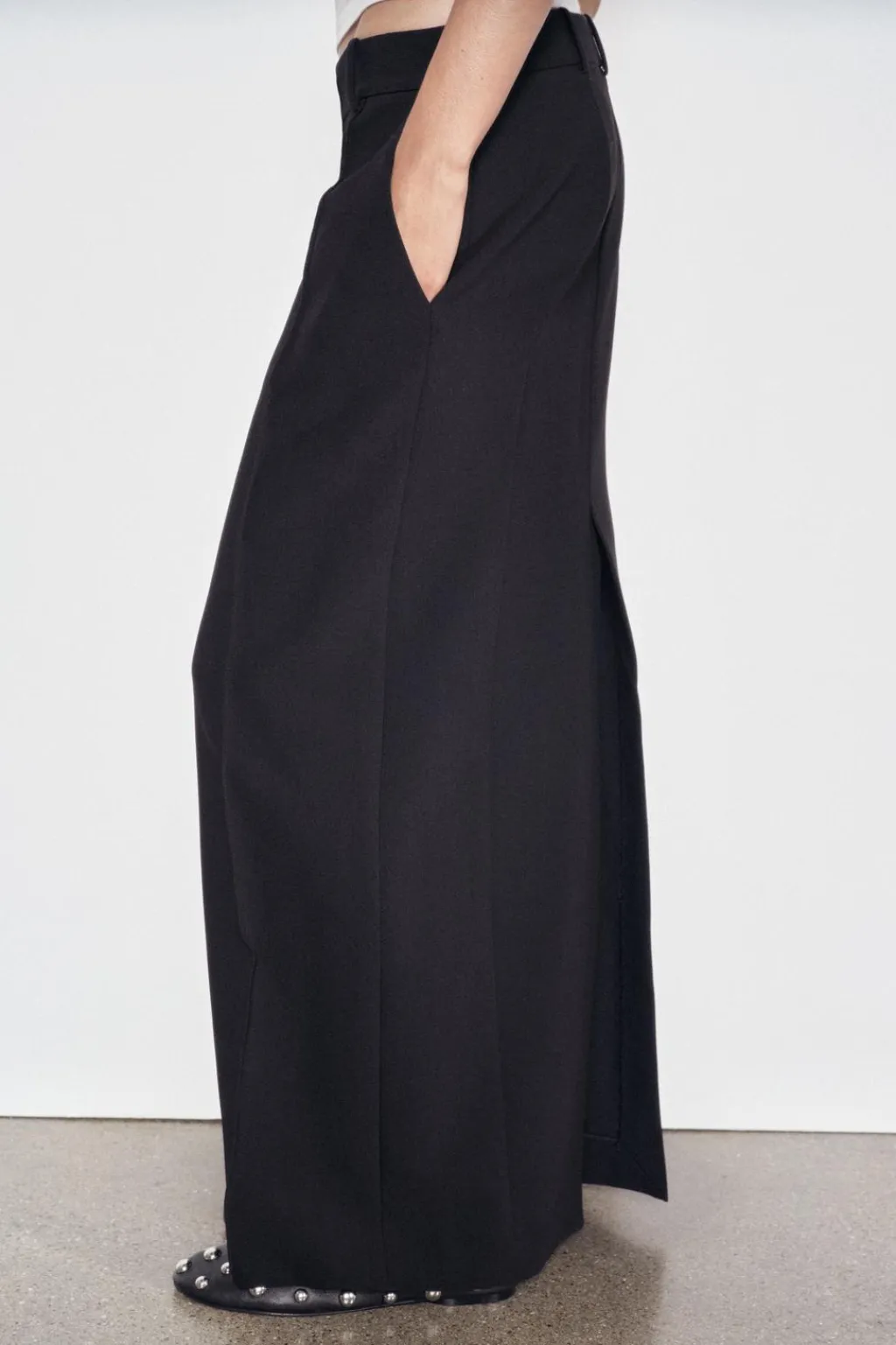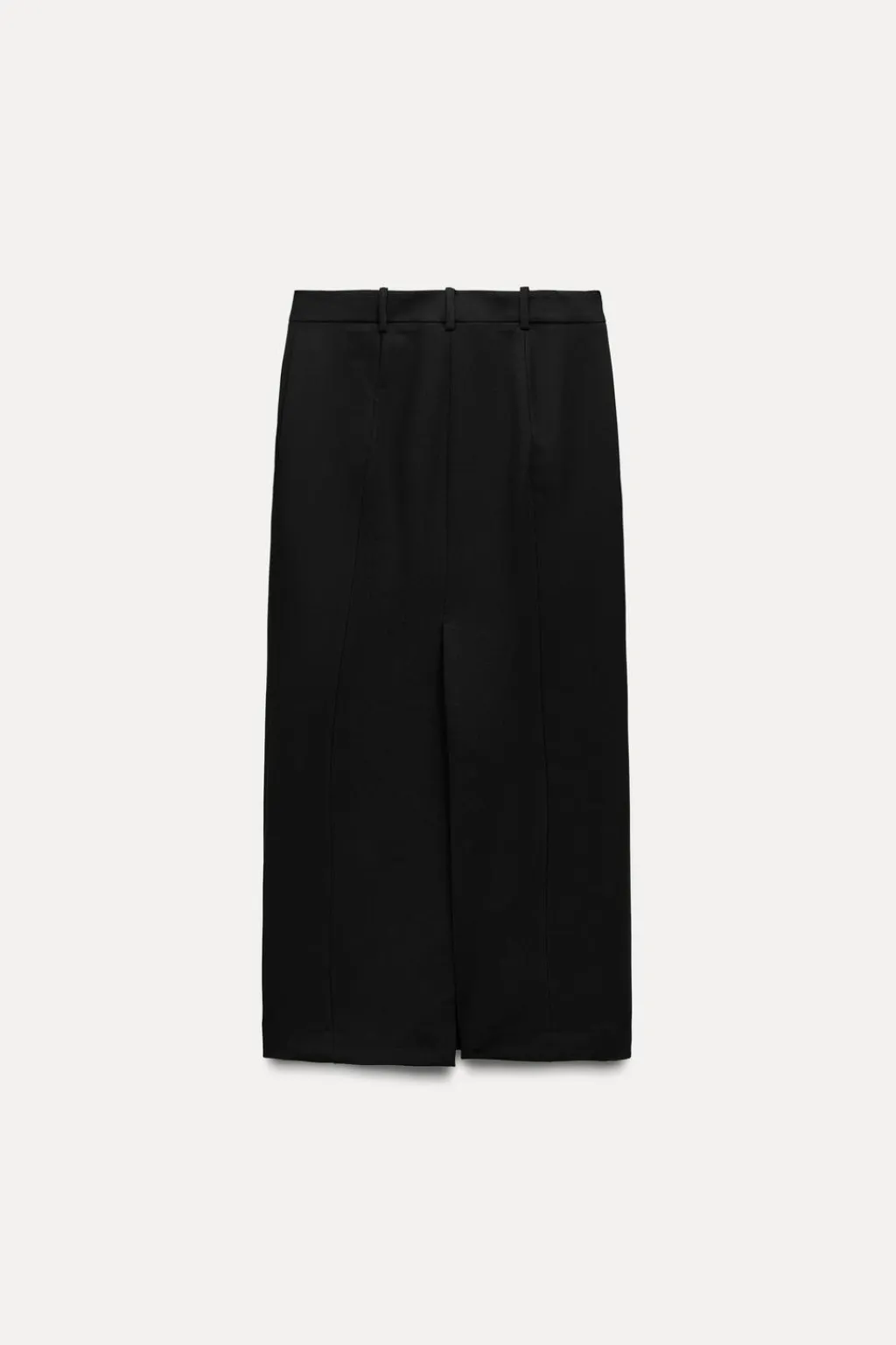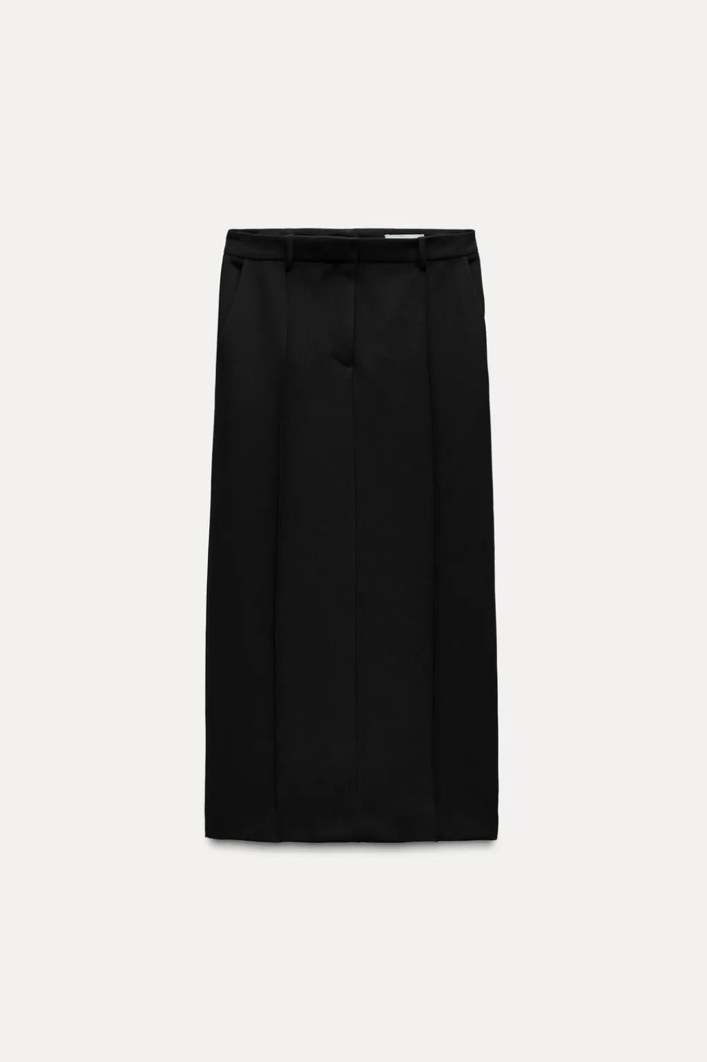 Falda larga de tiro bajo y cintura con trabillas. Bolsillos delanteros. Bajo acabado con abertura en espalda. Cierre frontal con cremallera, botón y gancho metálico.