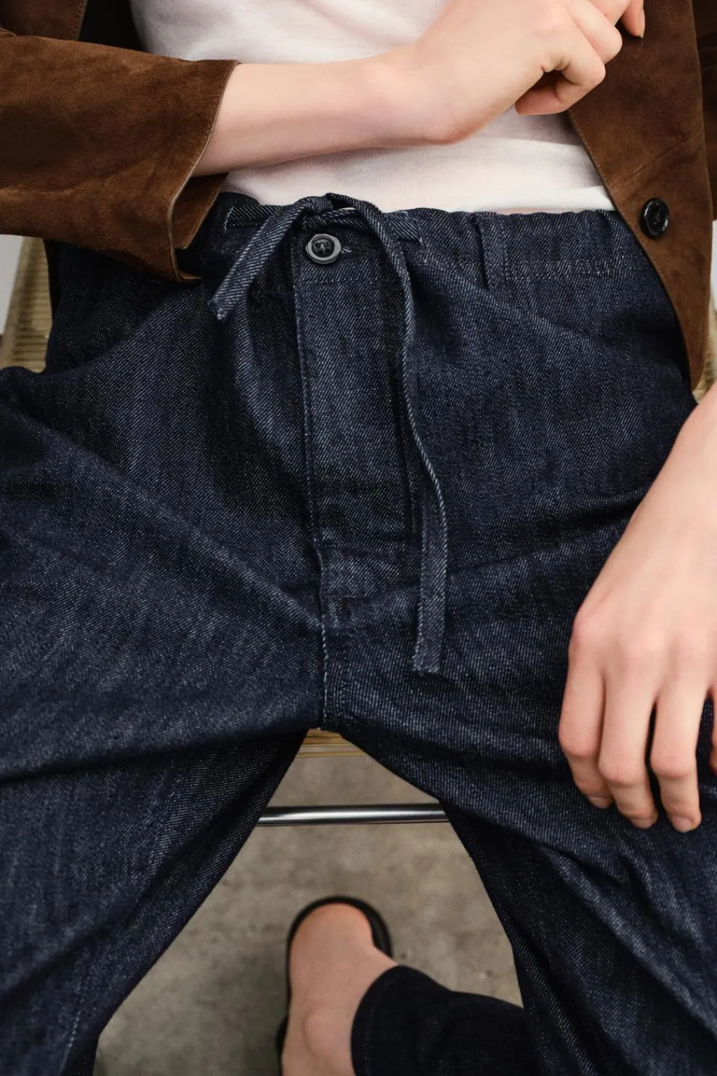 Jeans confeccionado en hilatura de algodón 100 % con tiro medio. Cintura ajustable con cordones. Bolsillos laterales y de plastrón en espalda. Cierre frontal con botones.