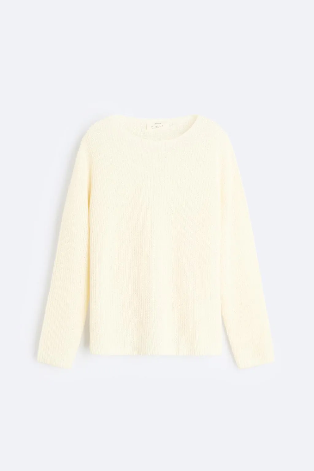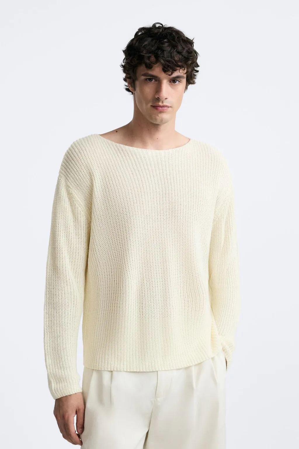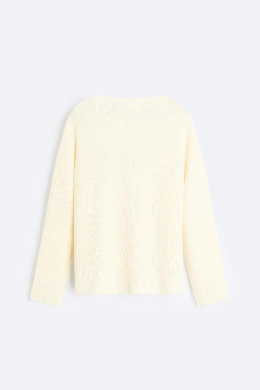 Jersey boxy fit tejido en hilatura de lino. Cuello barco y manga larga.