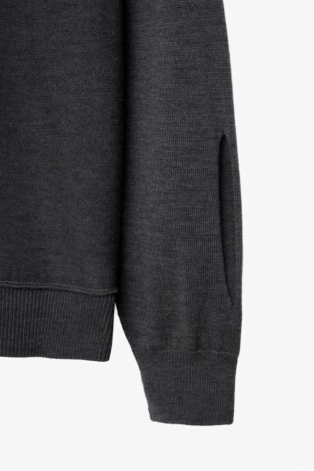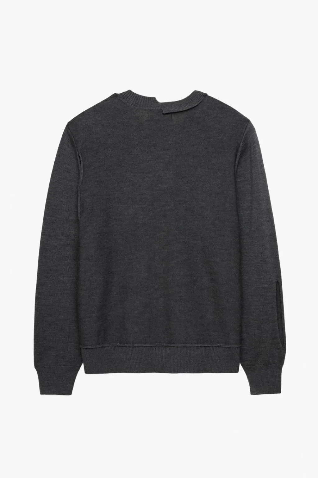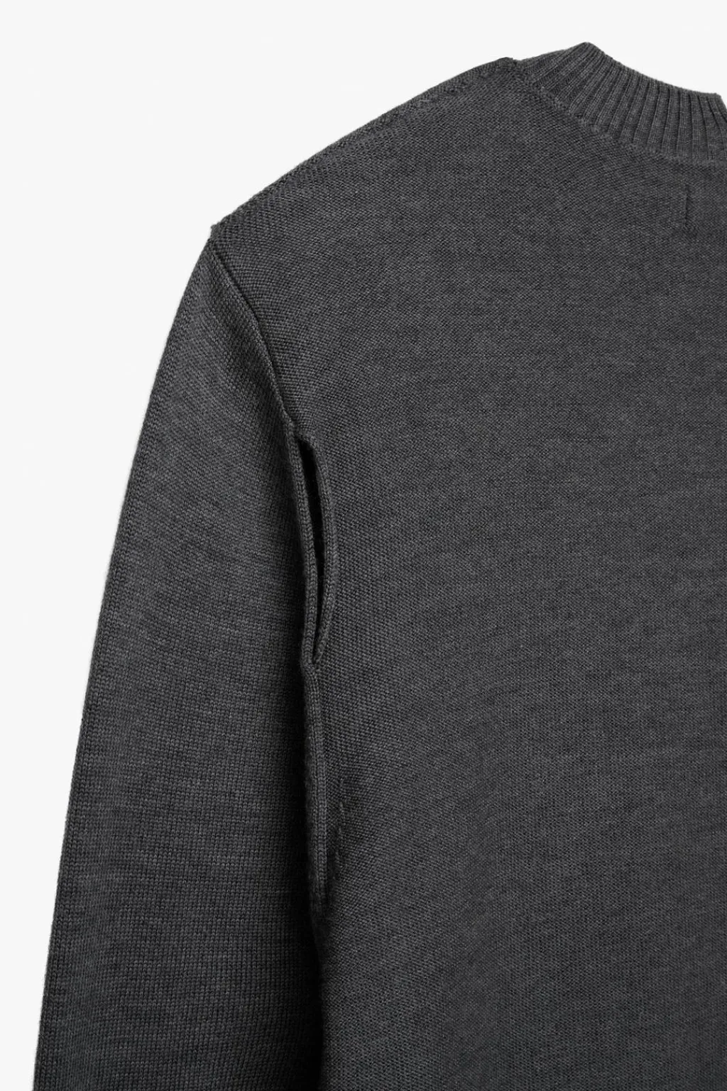 Jersey regular fit de punto tejido en hilatura de lana. Cuello redondo y hombro con aplicación de parches combinados a tono. Manga larga con detalle de cut out asimétrico. Acabados en rib.
