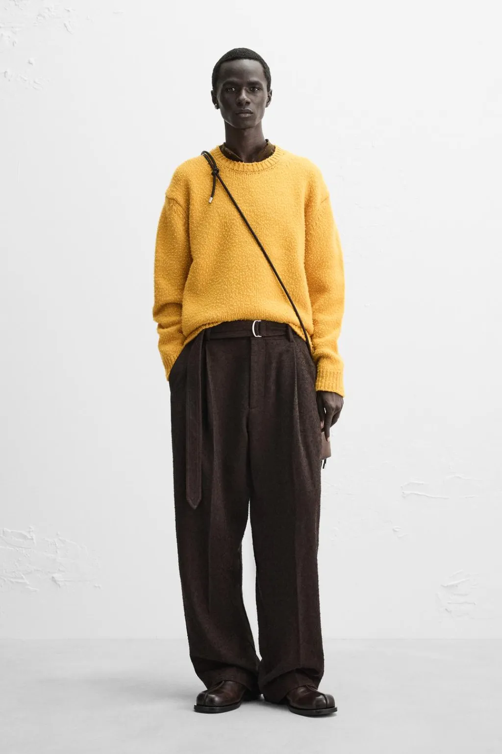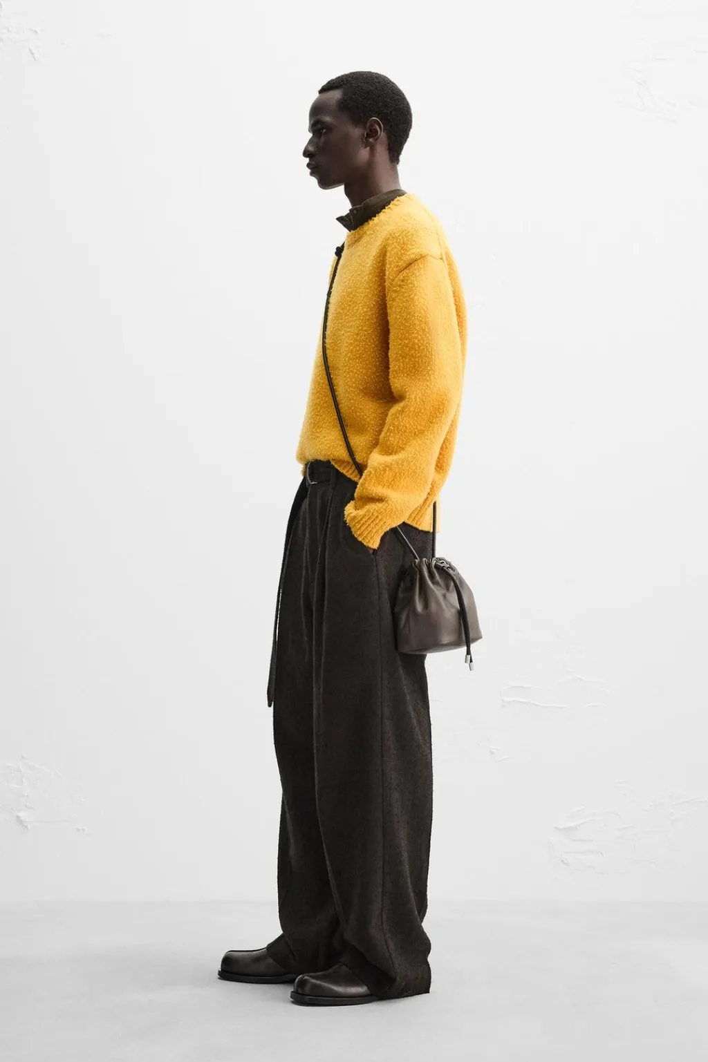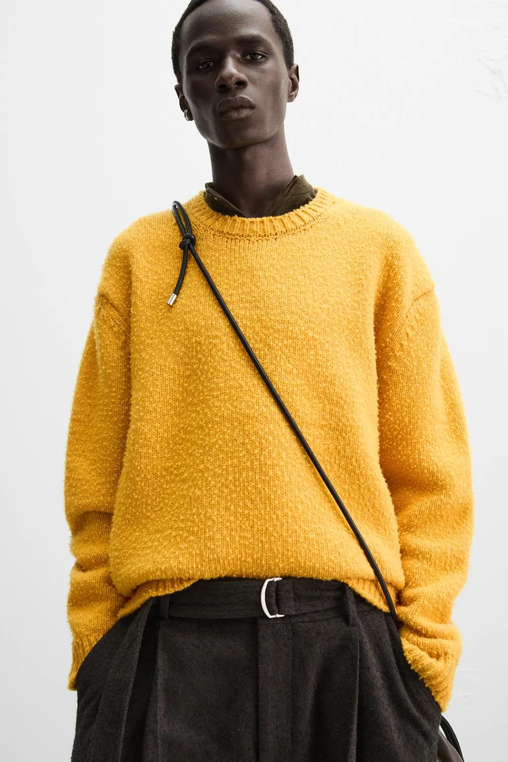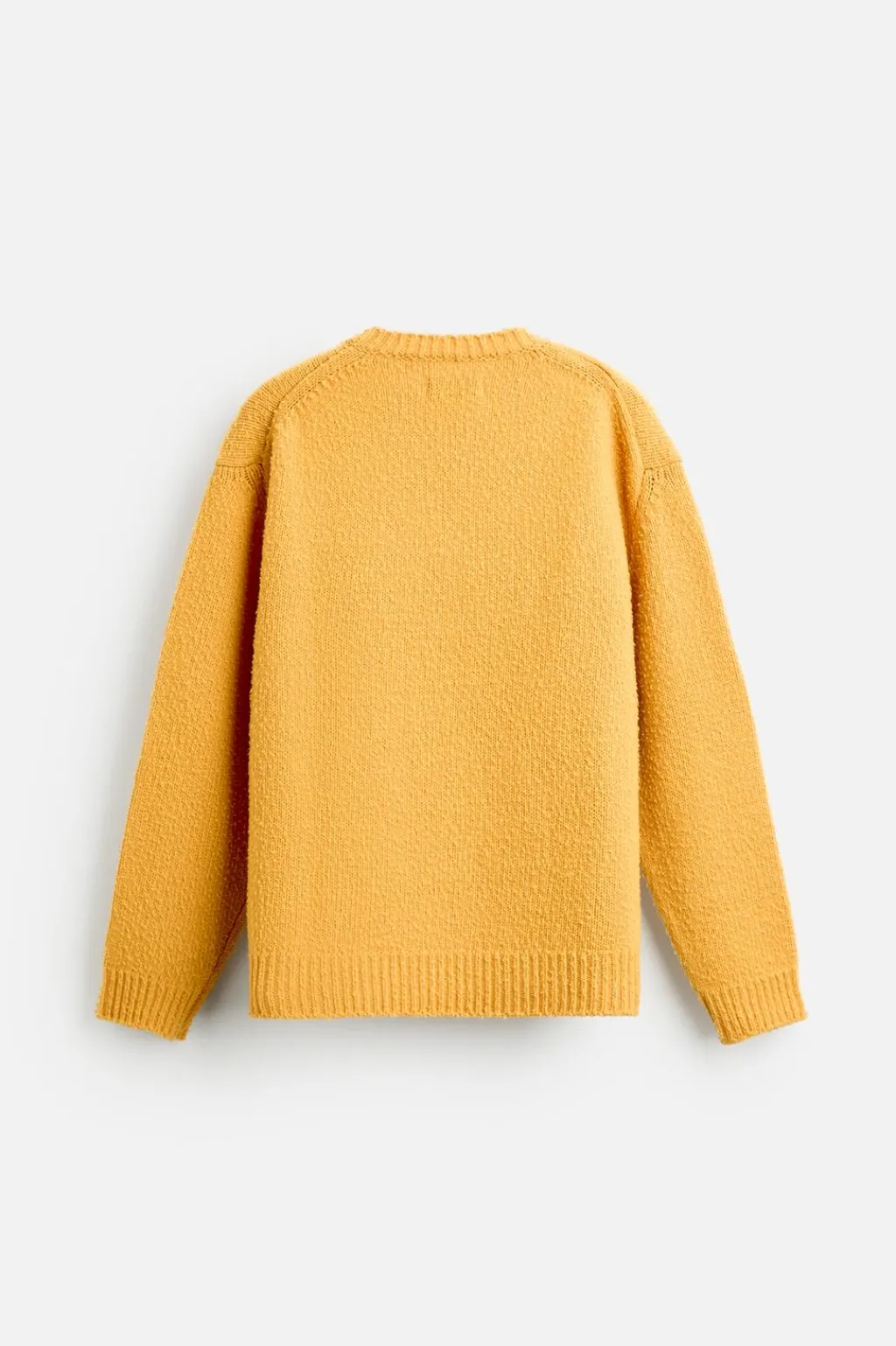 Jersey relaxed fit tejido en hilatura con mezcla de lana. Acabado efecto frisado. Cuello redondo y manga larga. Acabados en rib.