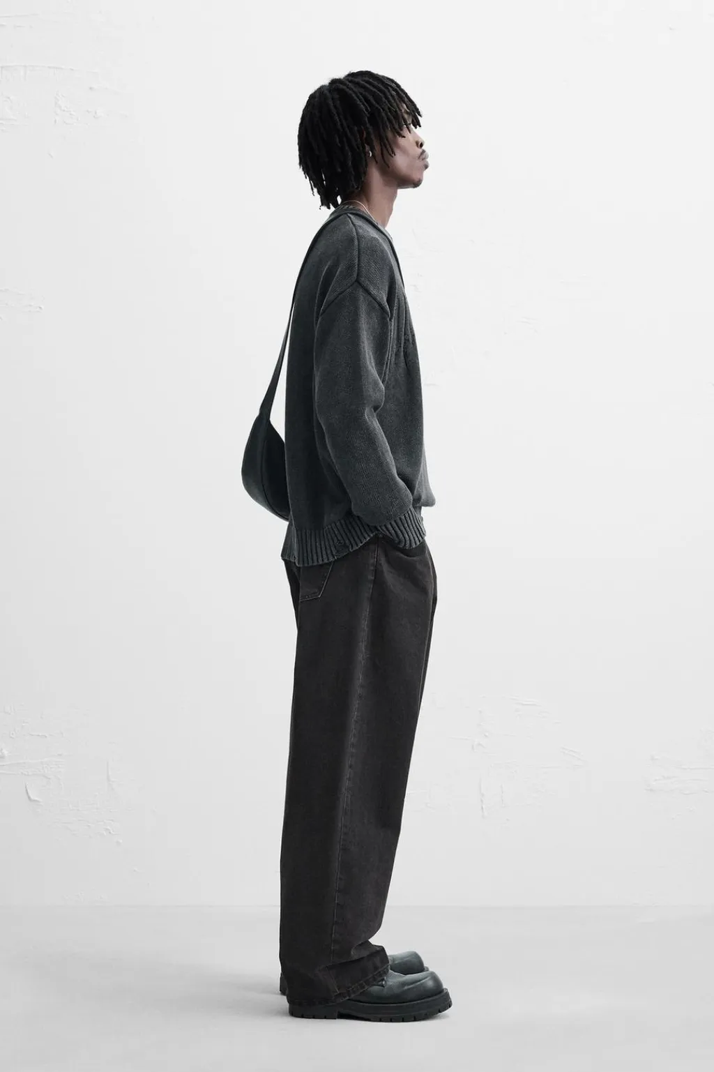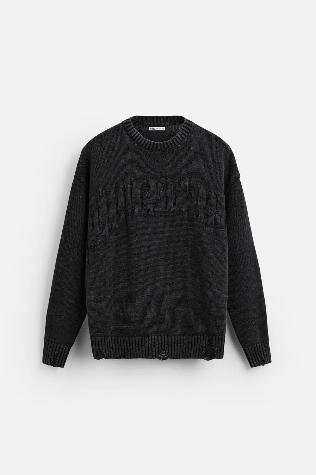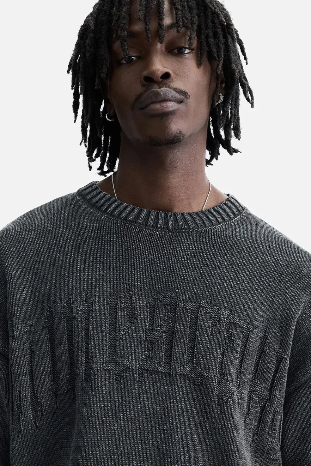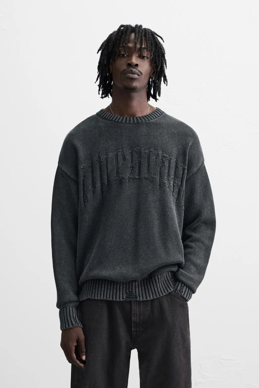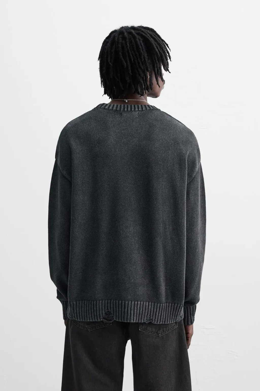 Jersey relaxed fit tejido en hilatura de algodón. Cuello redondo y manga larga. Acabado en rib con efecto rotos.