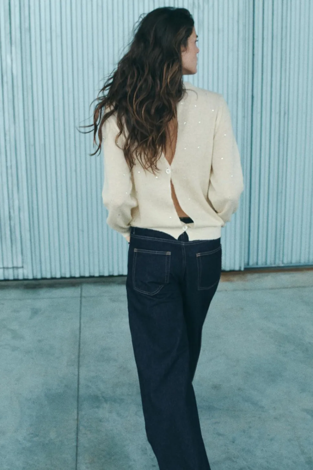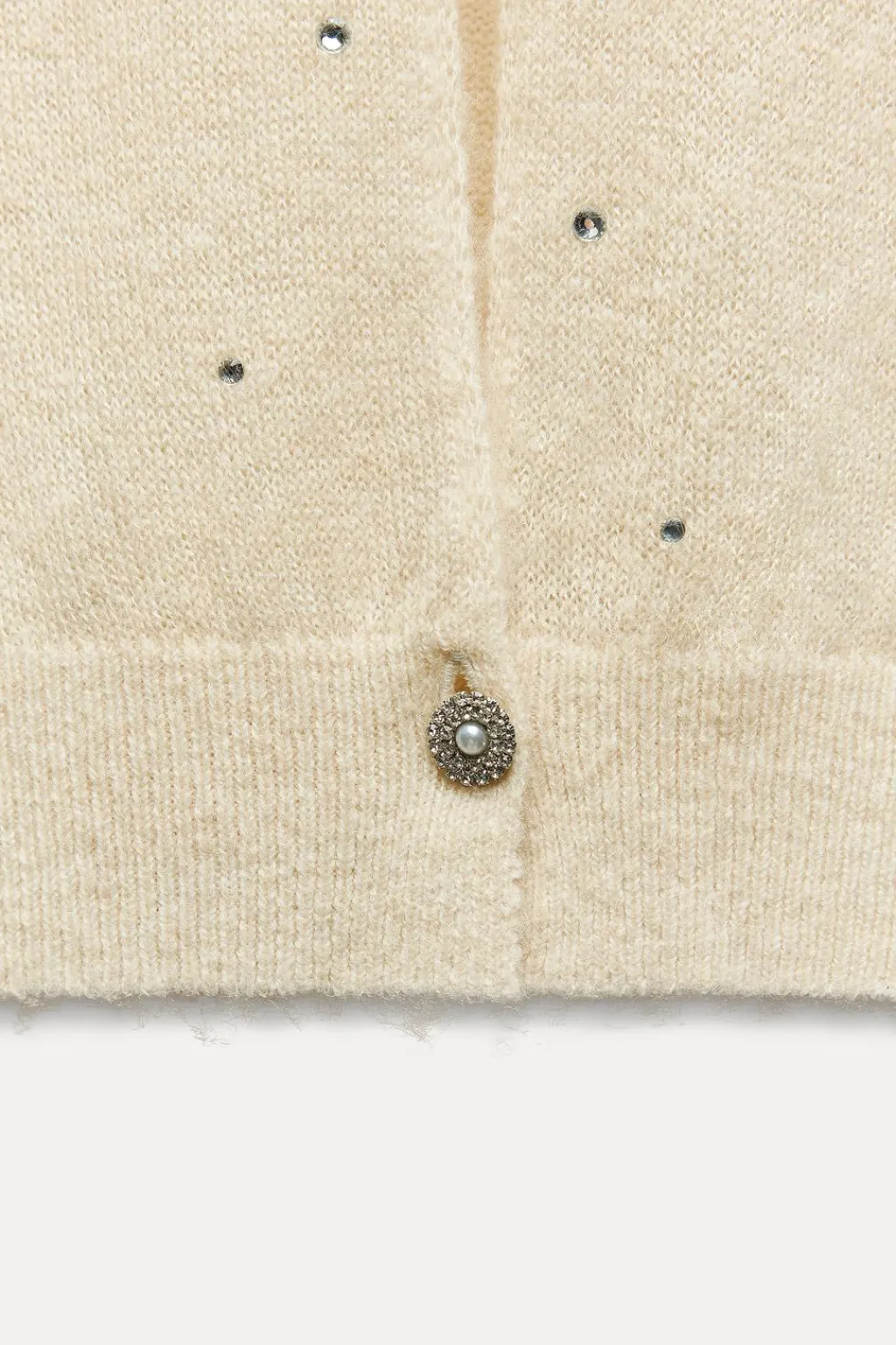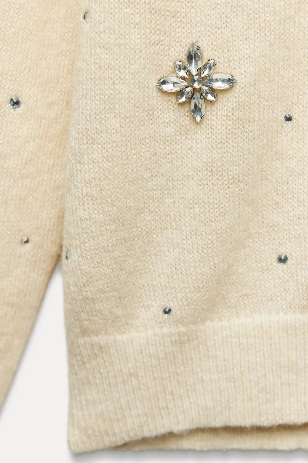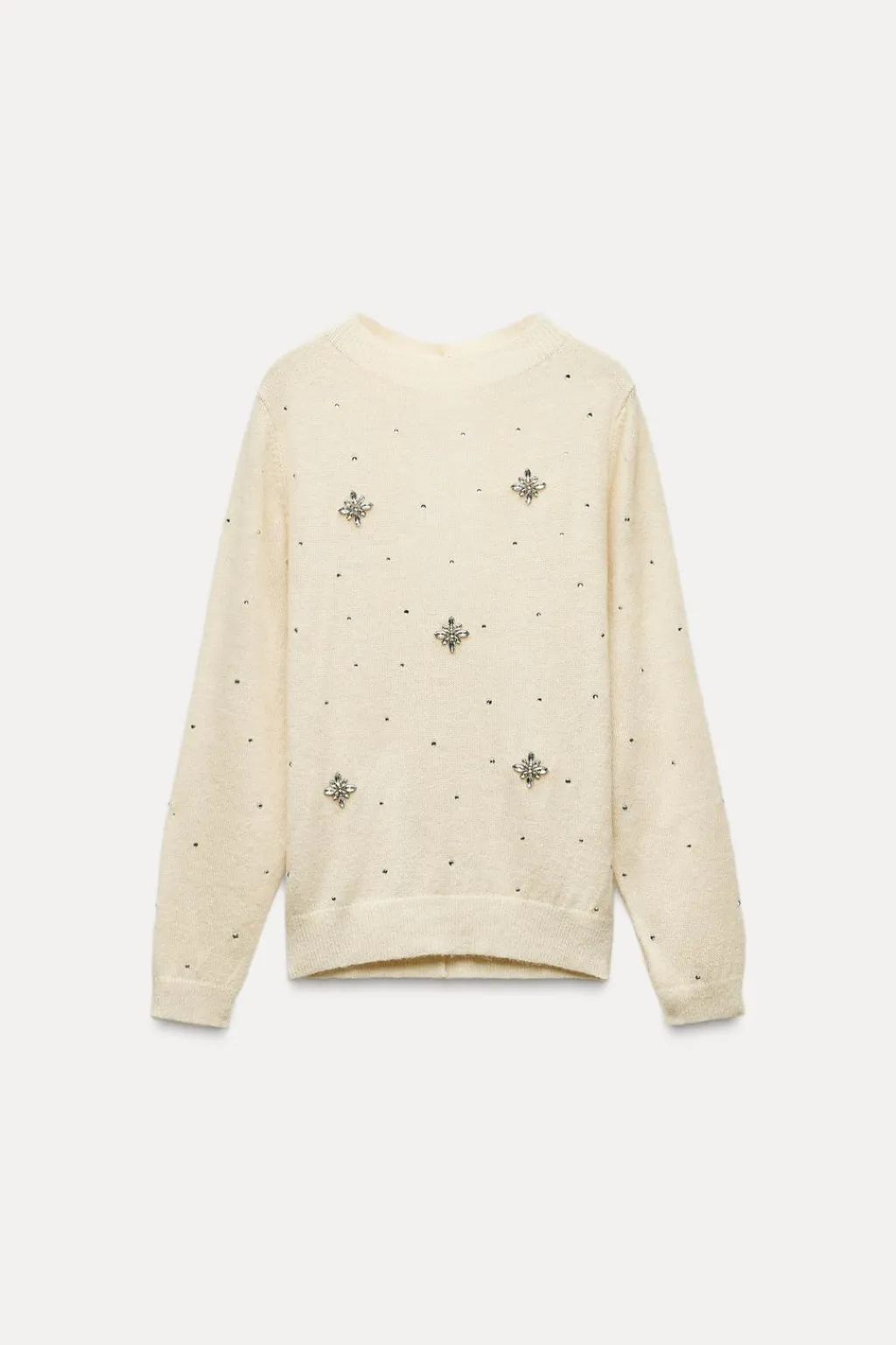 Jersey confeccionado en hilatura con lana 7%. Cuello redondo y manga larga. Detalle de aplicación de joyas y aberturas en espalda. Acabados en rib a tono.