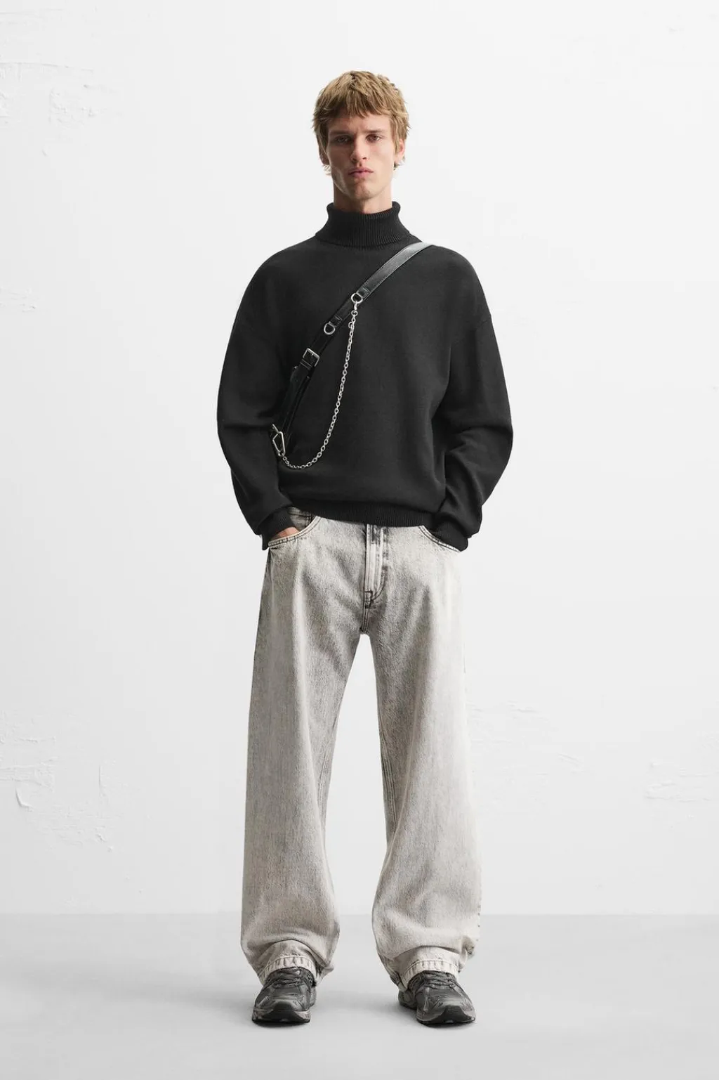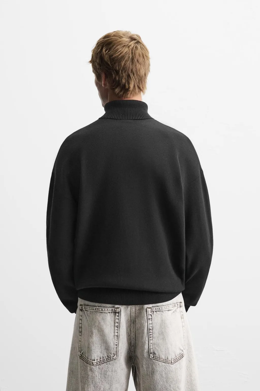 Jersey relaxed fit tejido en hilatura con viscosa y tacto suave. Cuello subido y manga larga. Acabados en rib.