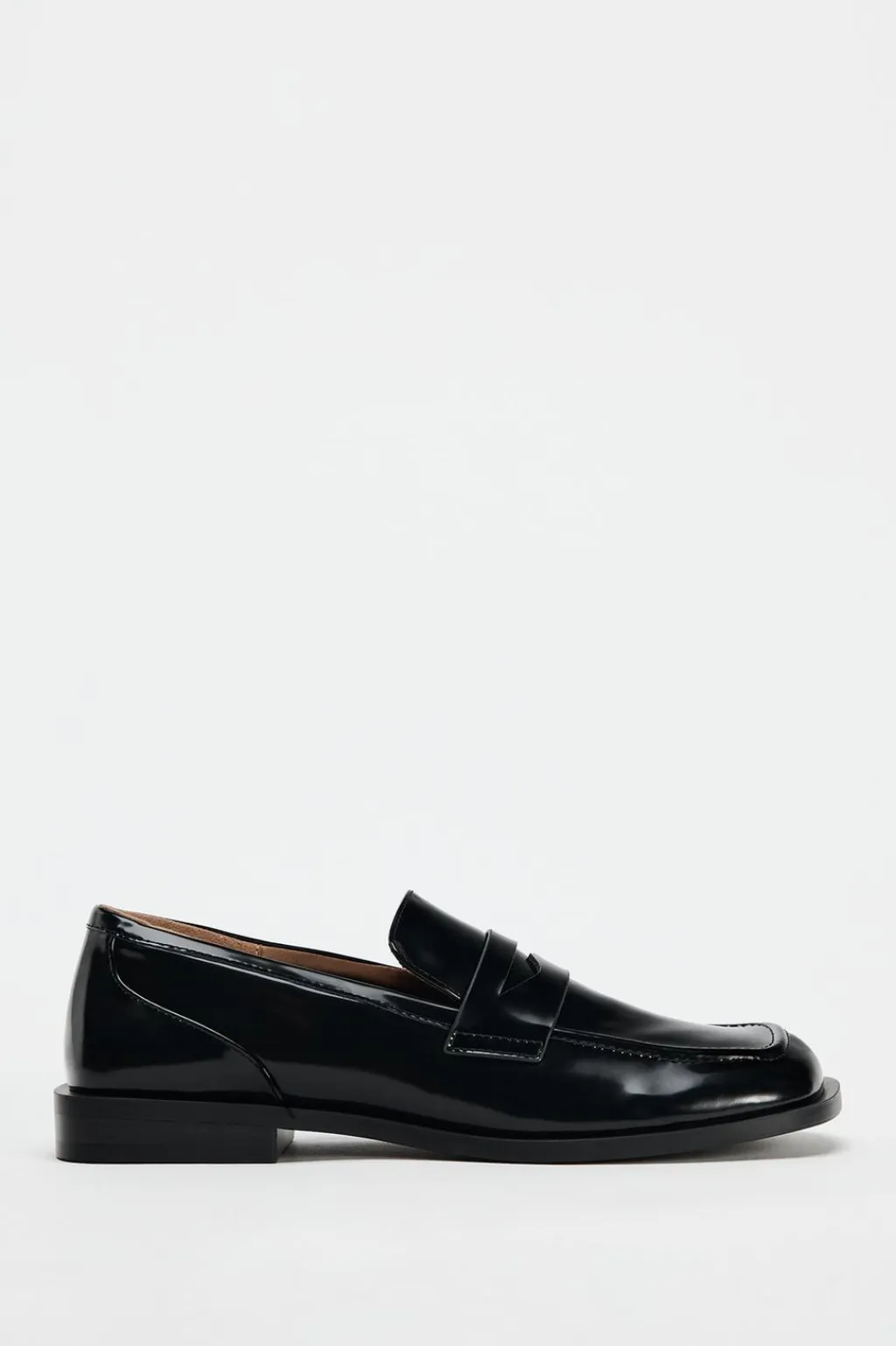 Zapato tipo mocasín. Efecto acharolado. Detalle de antifaz en la parte delantera. Acabado en punta cuadrada.