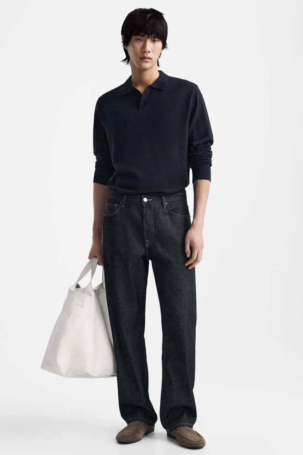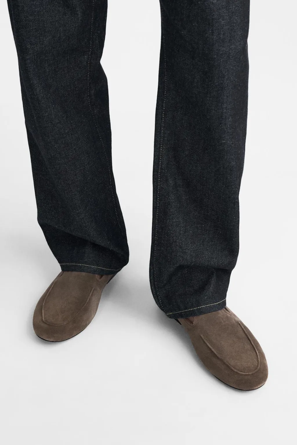 Mocasín fabricado en piel con acabado serraje. Detalle de bordón en el empeine. Suela fina.