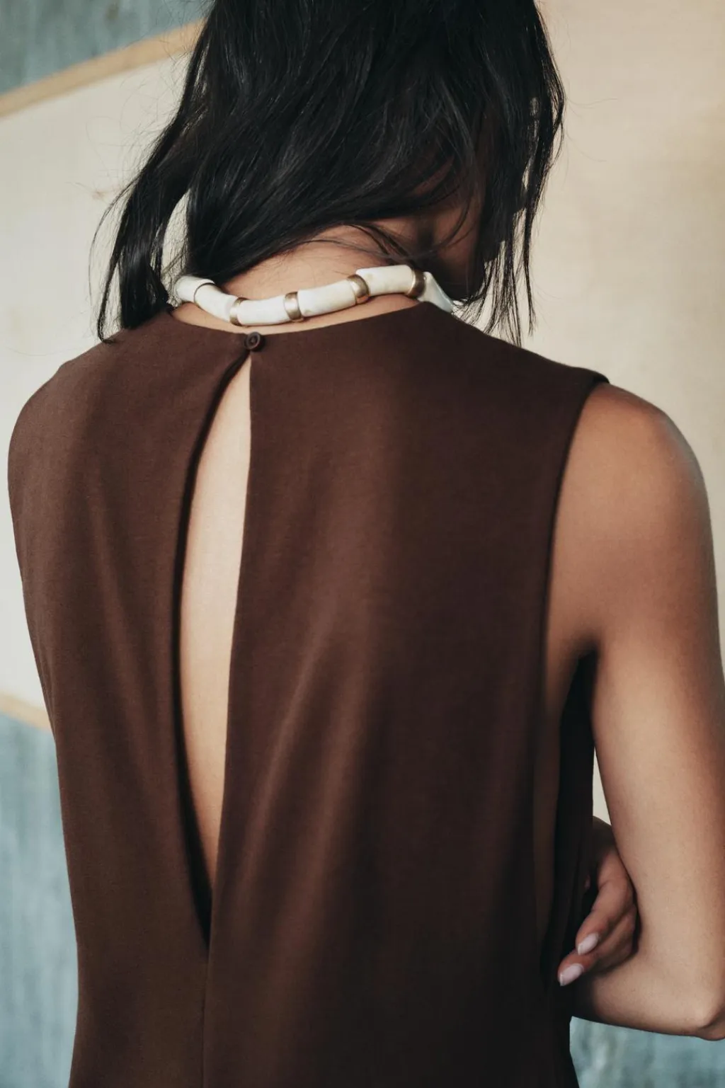 Mono largo confeccionado en hilatura de algodón compacto. Cuello redondo y manga sisa. Pierna ancha. Cierre en cuello con abertura y botón.