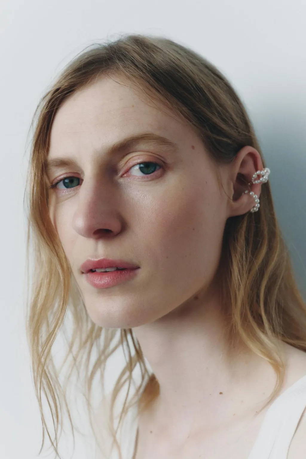 – Ear cuff metálico espiral con aplicación de perlas.