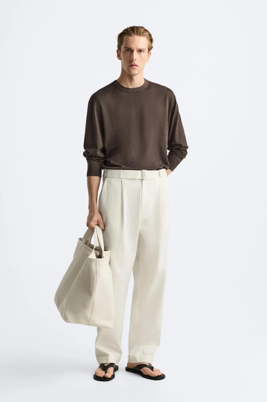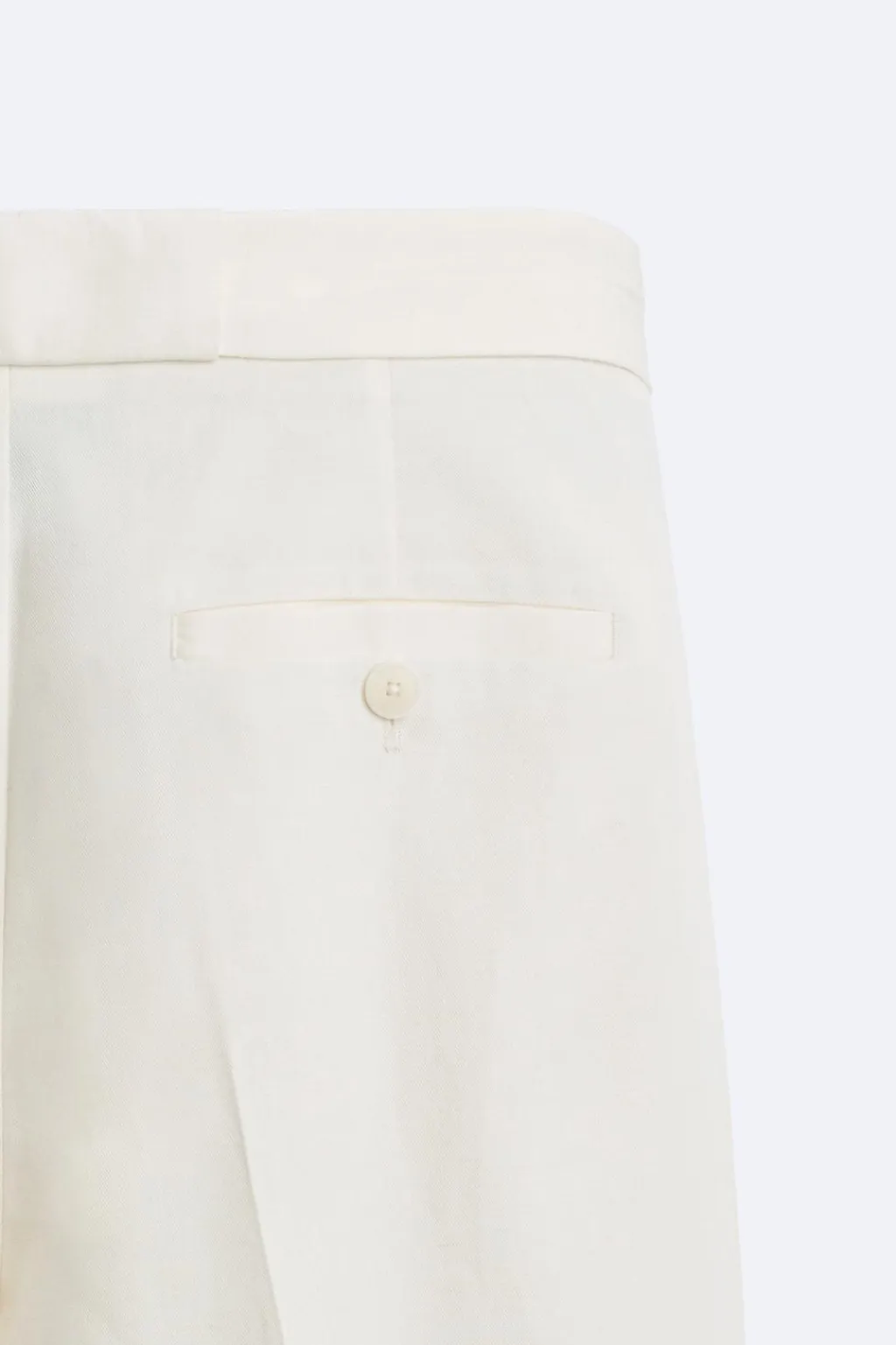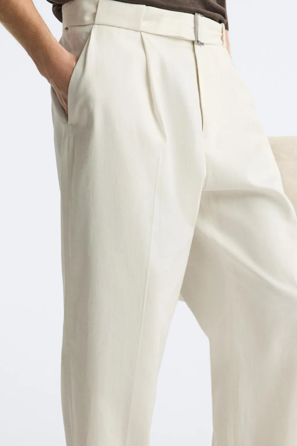 Pantalón relaxed fit confeccionado en tejido de lino y algodón. Cintura ajustable con cinturón del mismo tejido. Detalle de pliegues frontales. Bolsillos delanteros y detalle de bolsillos traseros de vivo. Bajo acabado con vuelta. Cierre frontal con cremallera y botón.
