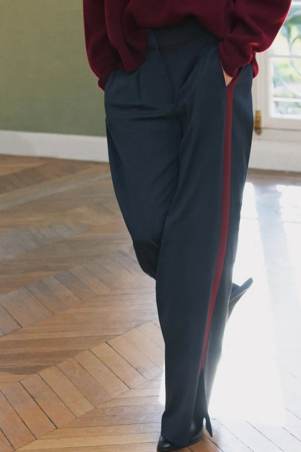 Pantalón de tiro medio confeccionado en hilatura con viscosa 23%. Bolsillos laterales y de vivo en espalda. Detalle de pinzas en delantero y banda lateral a contraste. Bajo acabado en aberturas. Cierre frontal con cremallera, botón y gancho metálico.