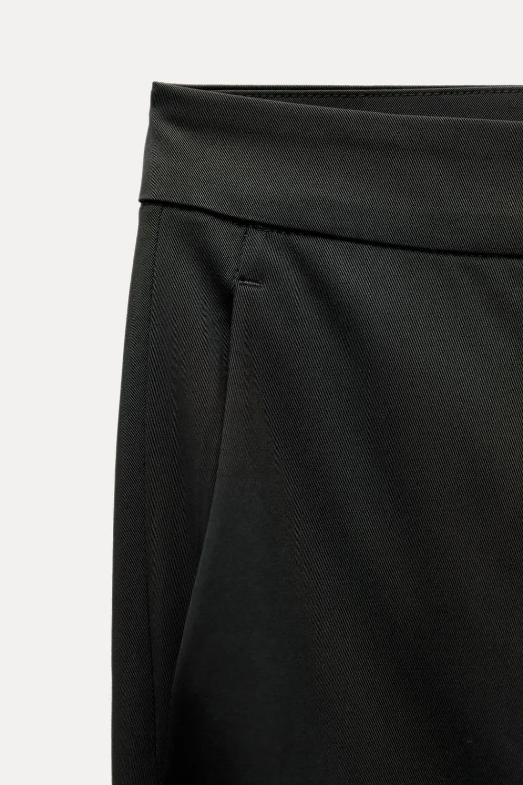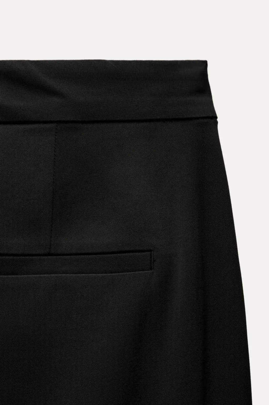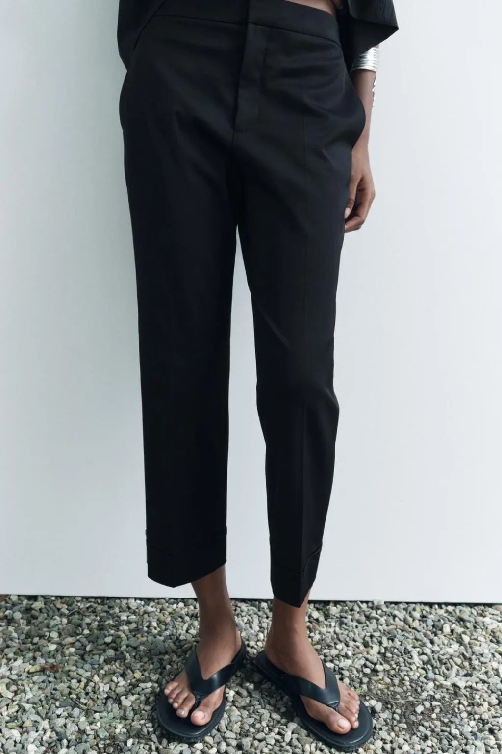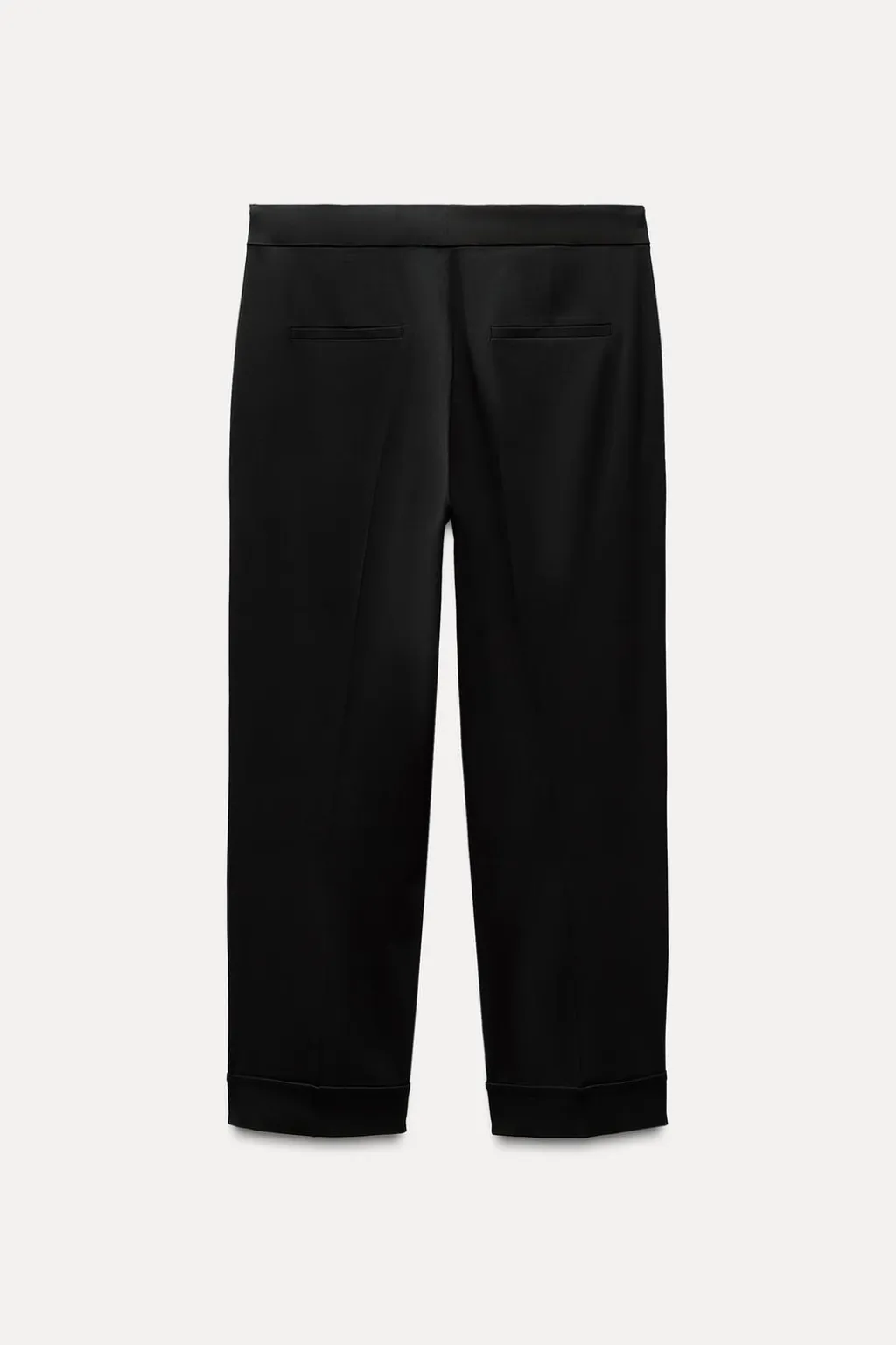 Pantalón tipo capri de tiro alto. Bolsillos laterales y falsos bolsillos de vivo en espalda. Bajo acabado con vuelta. Cierre frontal con cremallera, botón interior y ganchos metálicos.