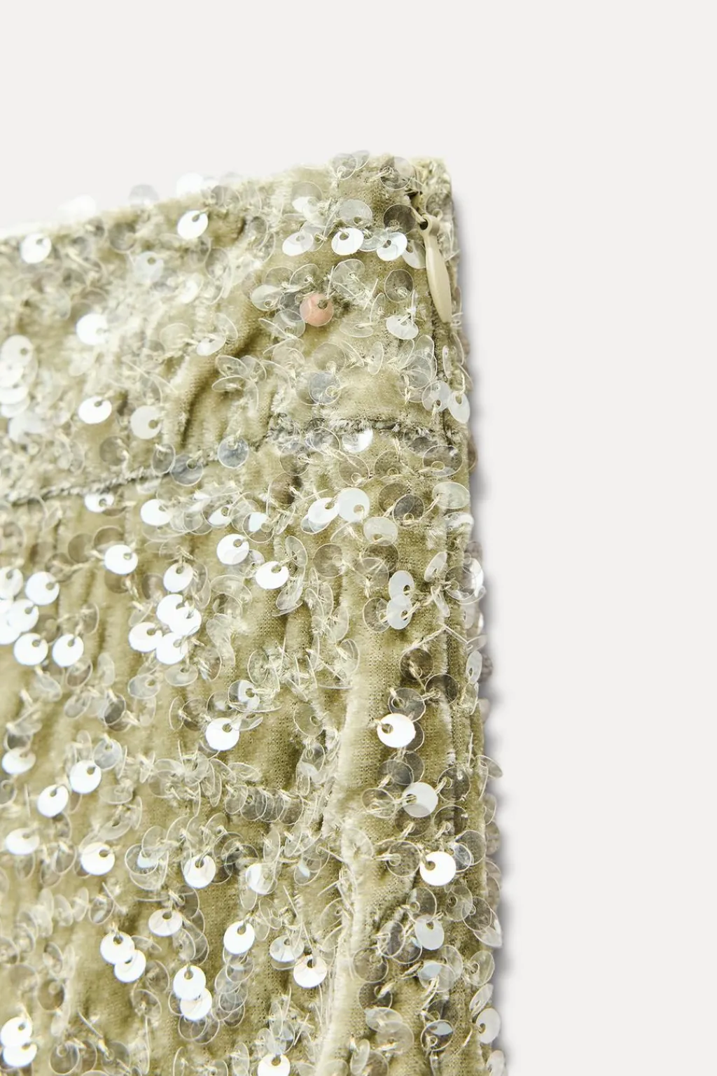 Pantalón de tiro alto con lentejuelas. Bajo acabado en evasé. Cierre lateral con cremallera oculta en costura.