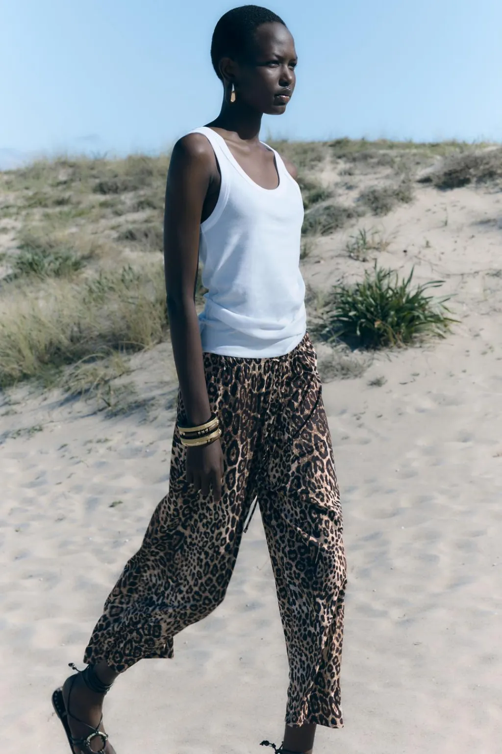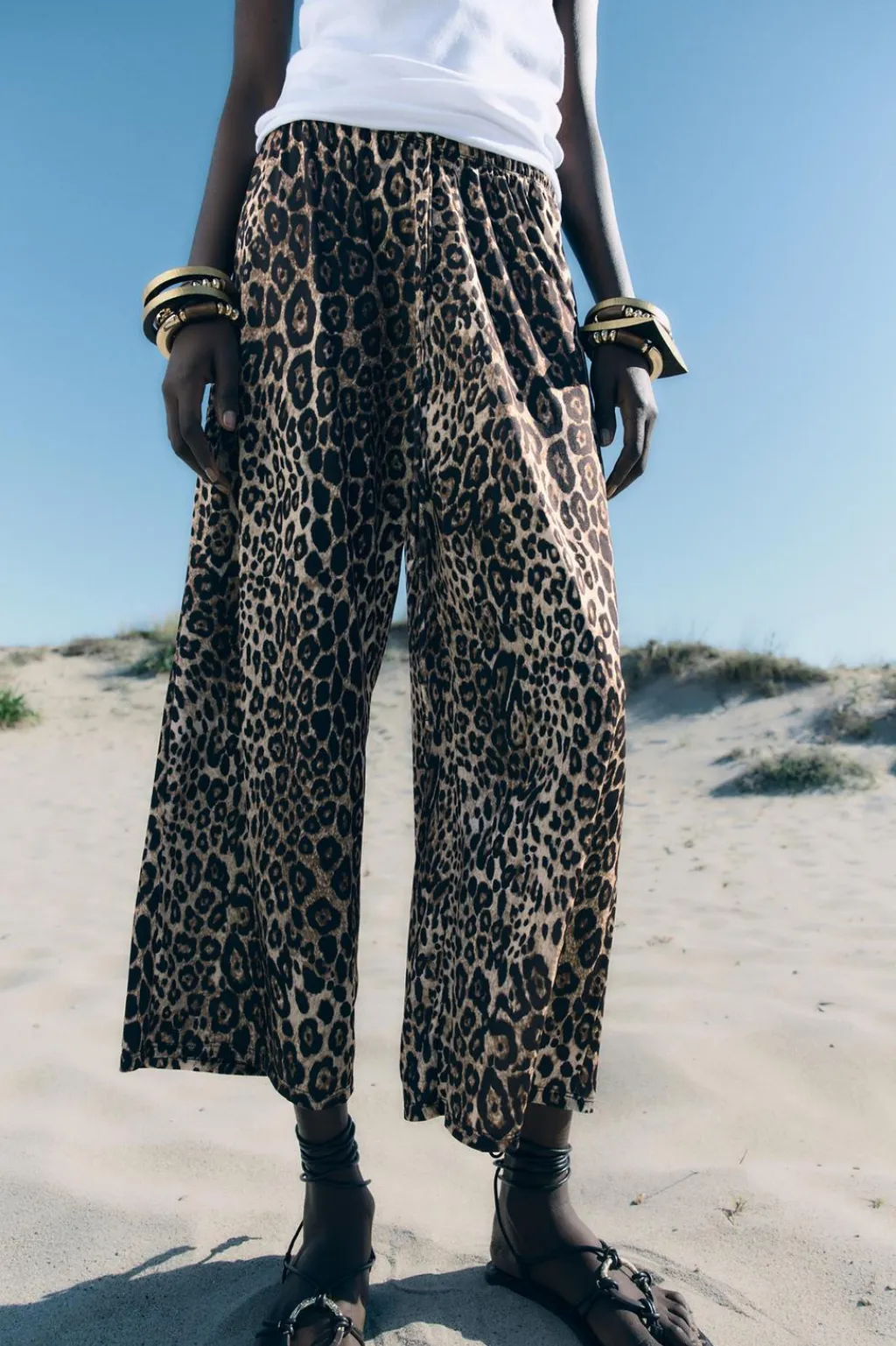 Pantalón de tiro medio y cintura ajustable con cordones en mismo tejido. Pierna ancha.