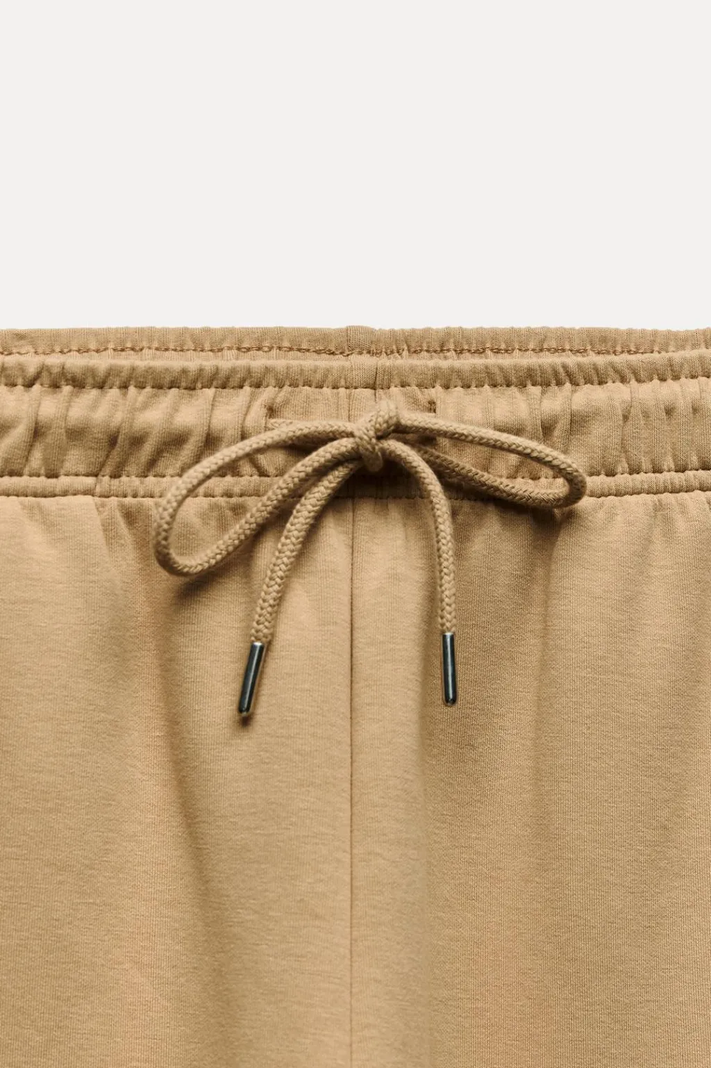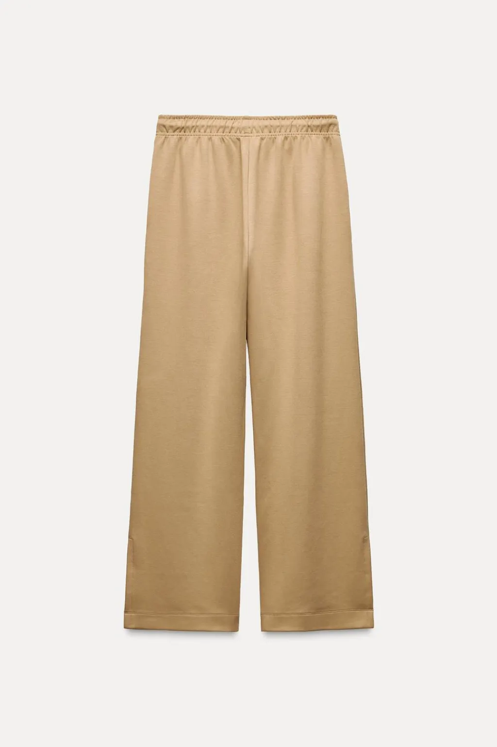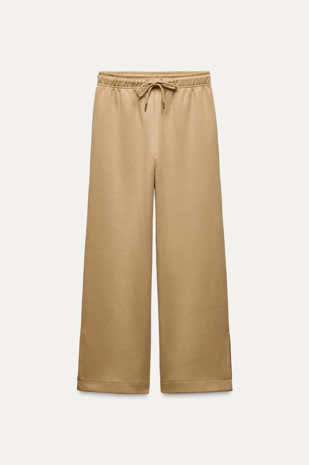 Pantalón confeccionado en tejido de punto elástico y flexible con trama compacta, mullida y opaca. Tiro medio y cintura elástica ajustable con cordones. Bolsillos laterales ocultos en costura. Bajo acabado en aberturas laterales.