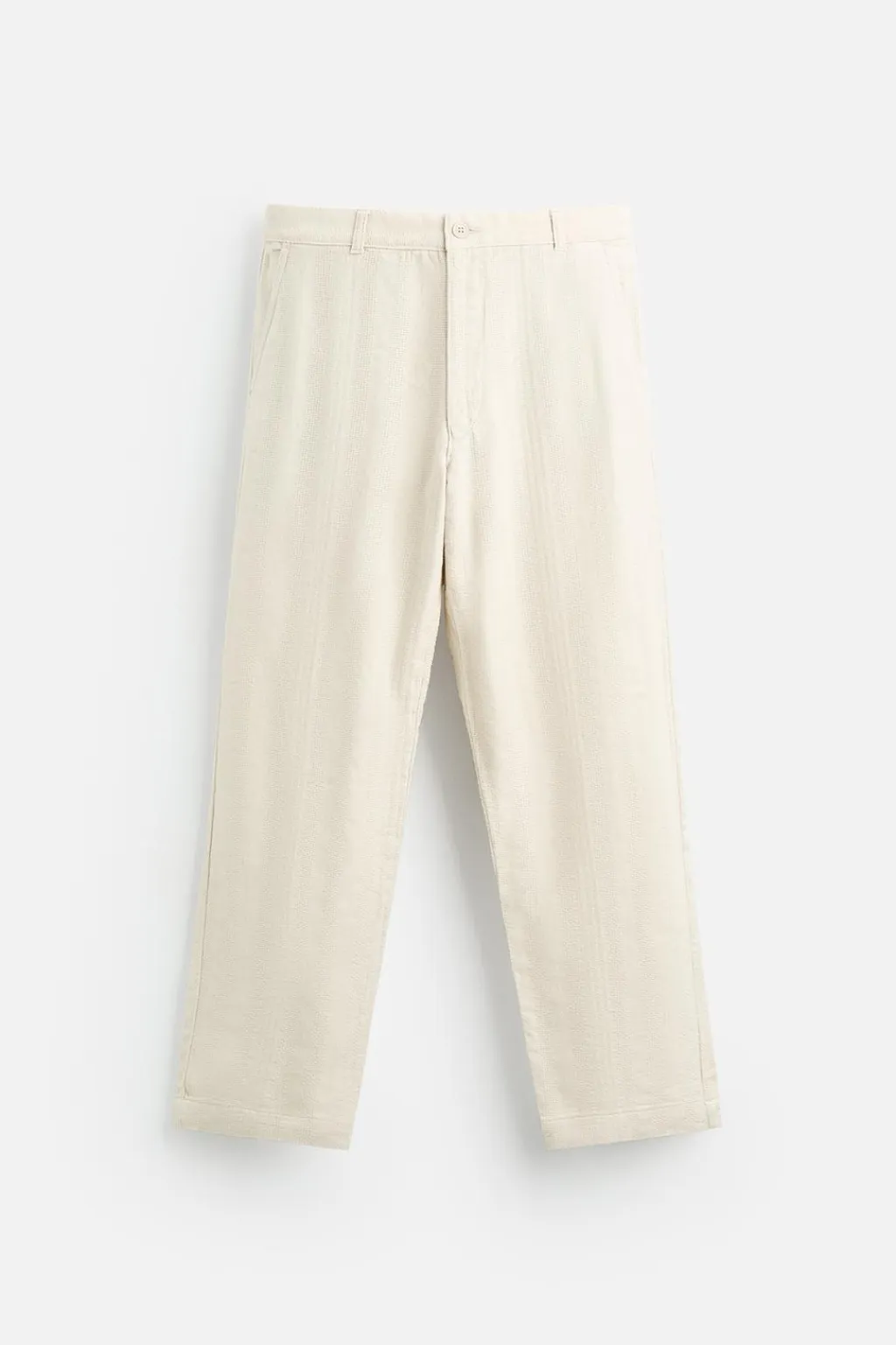 Pantalón straight fit. Bolsillos frontales y detalle de bolsillos traseros de doble vivo. Cierre frontal con cremallera y botón.