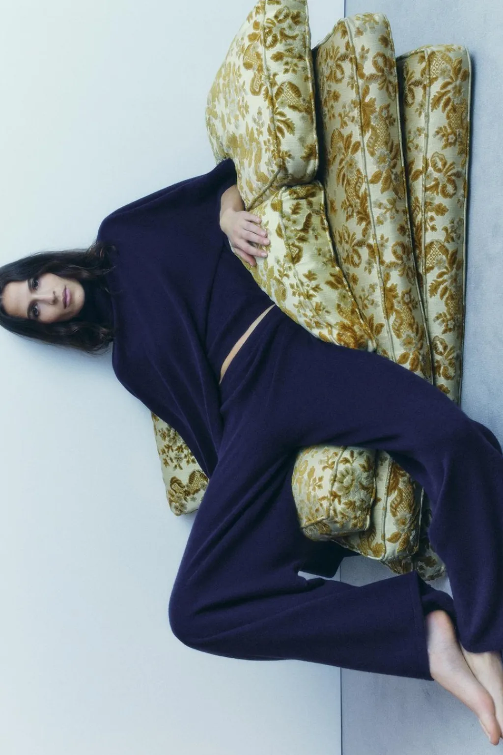 Pantalón confeccionado en mezcla de lana y cashmere 10%. Tiro medio y cintura elástica. Pierna ancha.