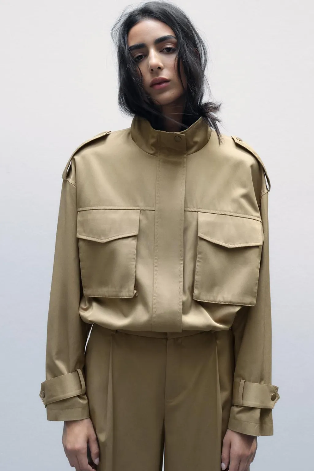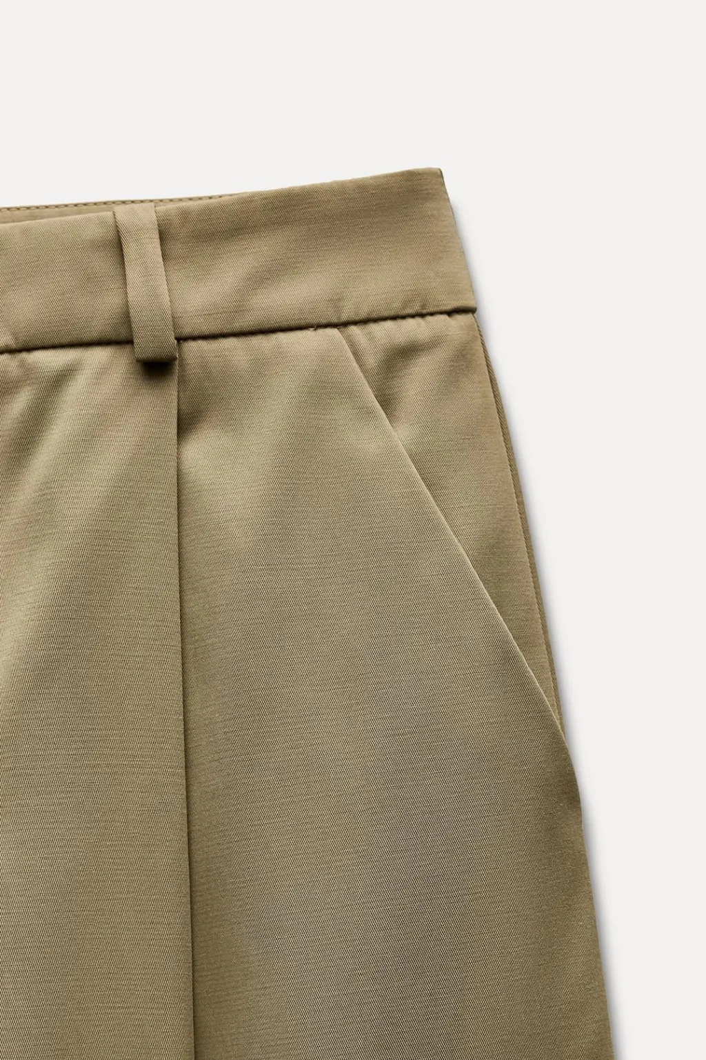Pantalón de tiro alto con trabillas. Bolsillos laterales y falsos bolsillos de vivo en espalda. Detalle de pinzas en delantero. Cierre frontal con cremallera, botón interior y gancho metálico.