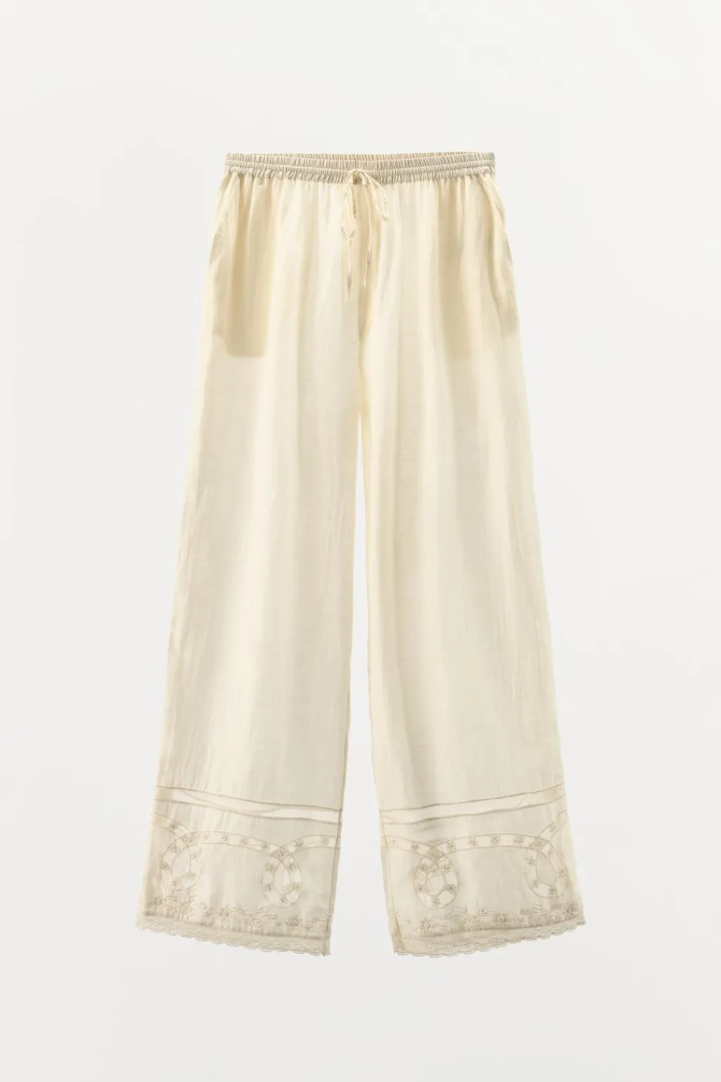 Pantalón confeccionado en mezcla de viscosa y lino 10%. Tiro medio con cintura elástica ajustable con lazada. Bolsillos laterales ocultos en costura. Detalle aplicación de puntilla, bordados y abalorios combinados a tono. Pierna ancha.