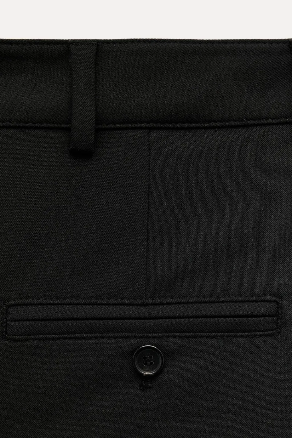 Pantalón de tiro bajo y cintura con trabillas. Bolsillos laterales y de vivo en espalda. Detalle de raya planchada en delantero. Cierre frontal con cremallera, botón y gancho metálico.