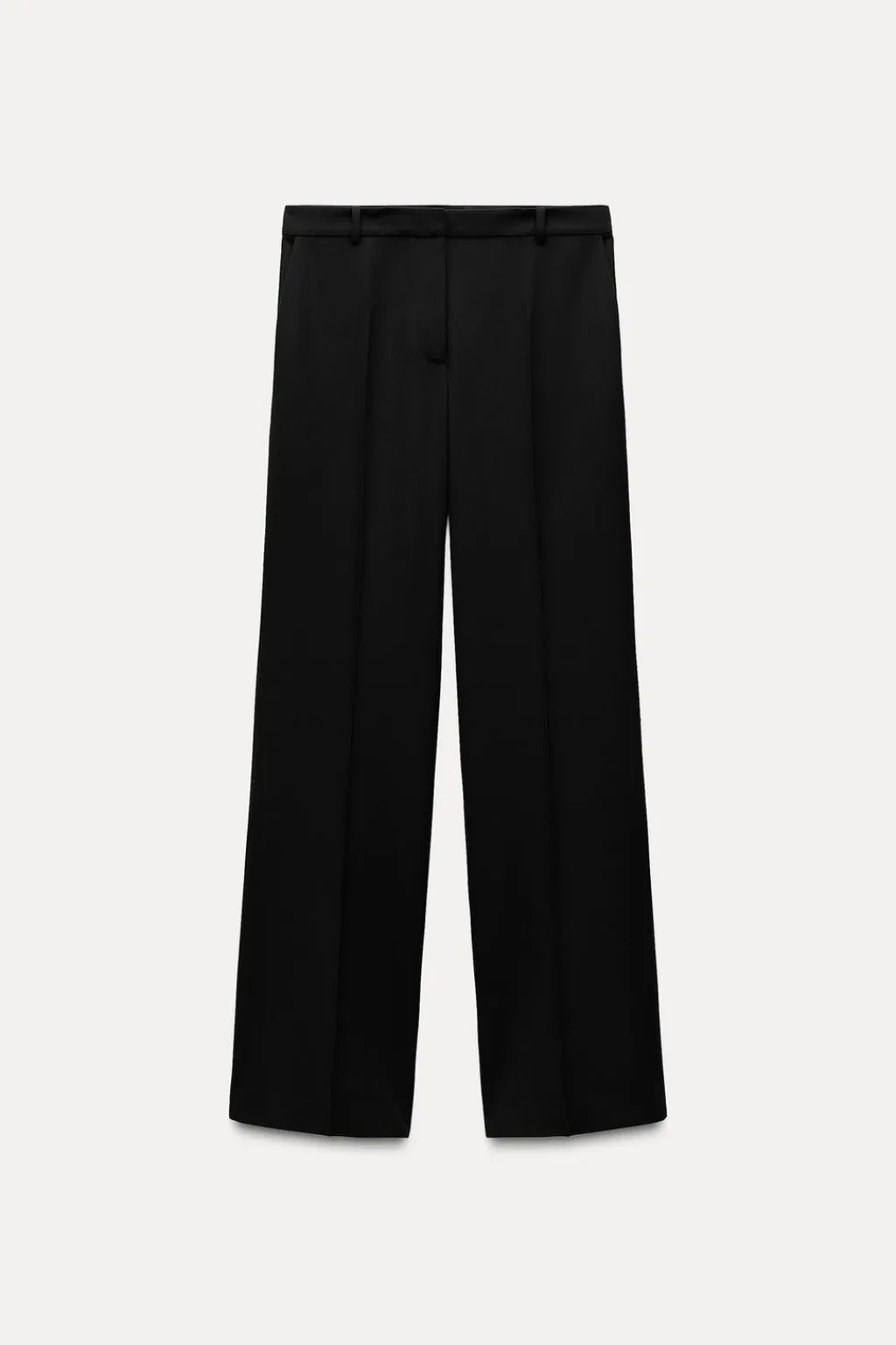 Pantalón de tiro medio confeccionado en hilatura con viscosa. Cintura con trabillas. Detalle de raya planchada. Pierna recta. Cierre frontal con cremallera, botón y gancho metálico.