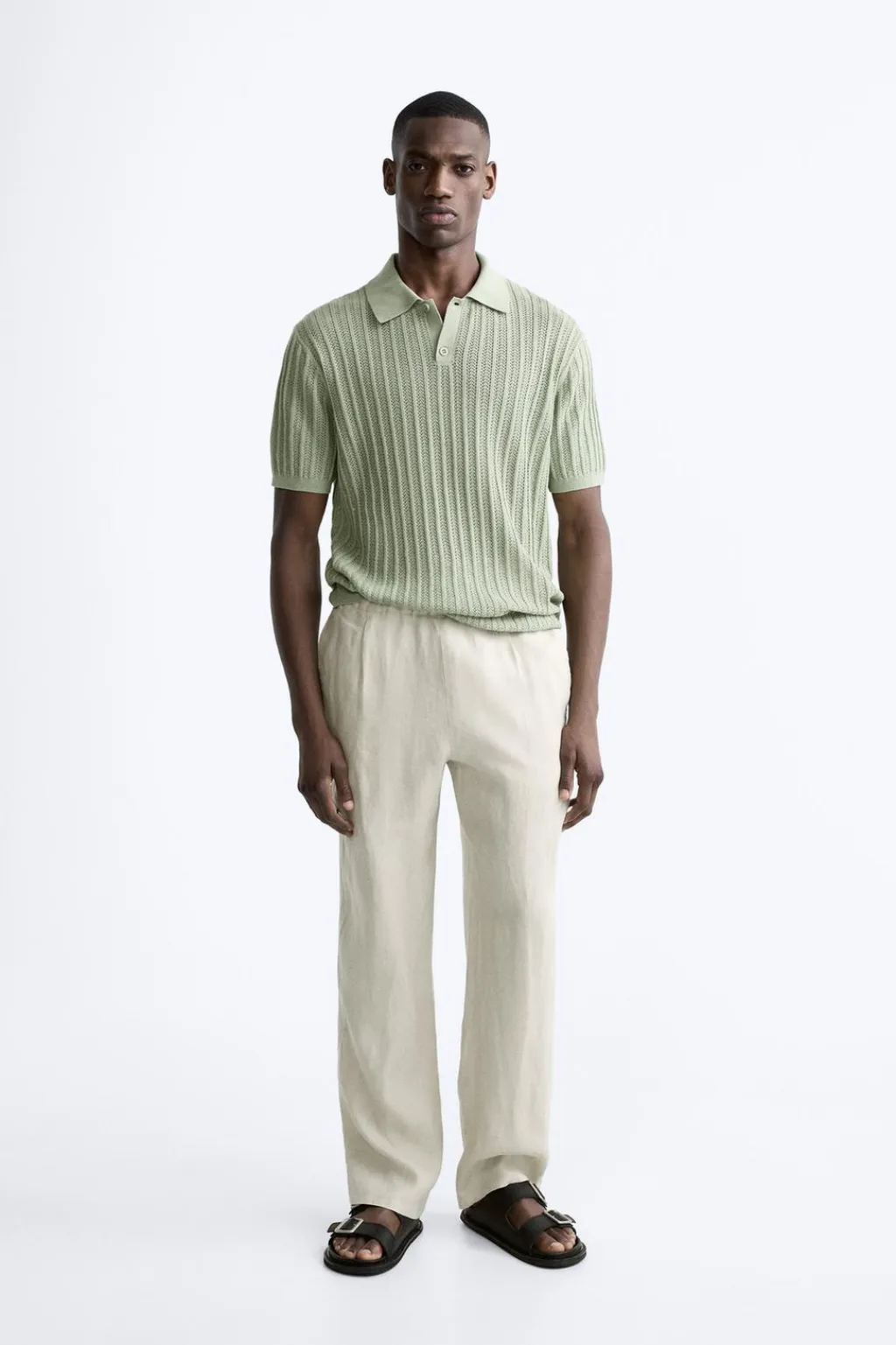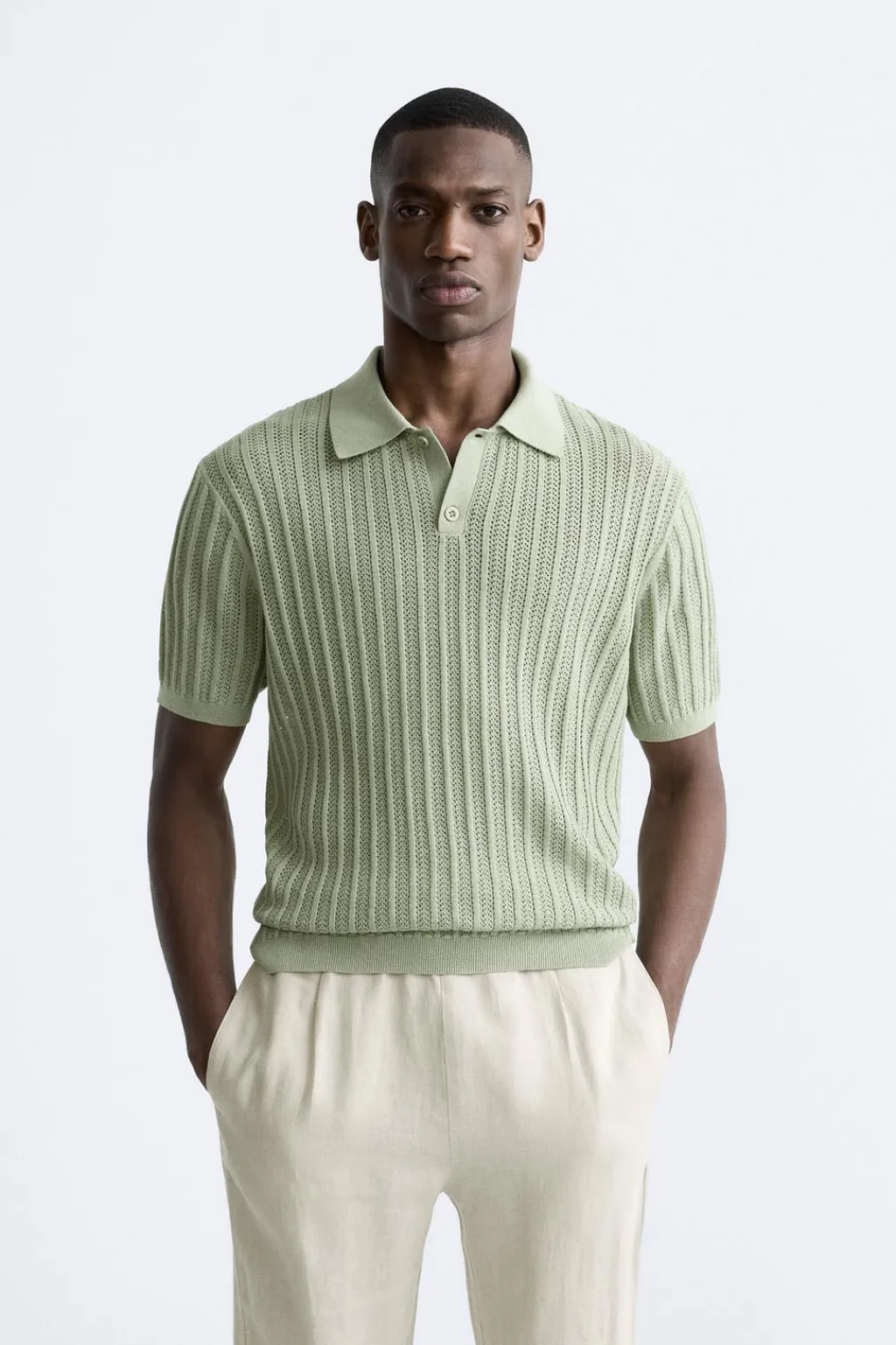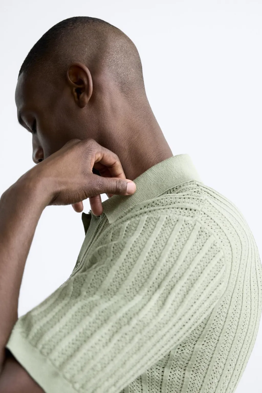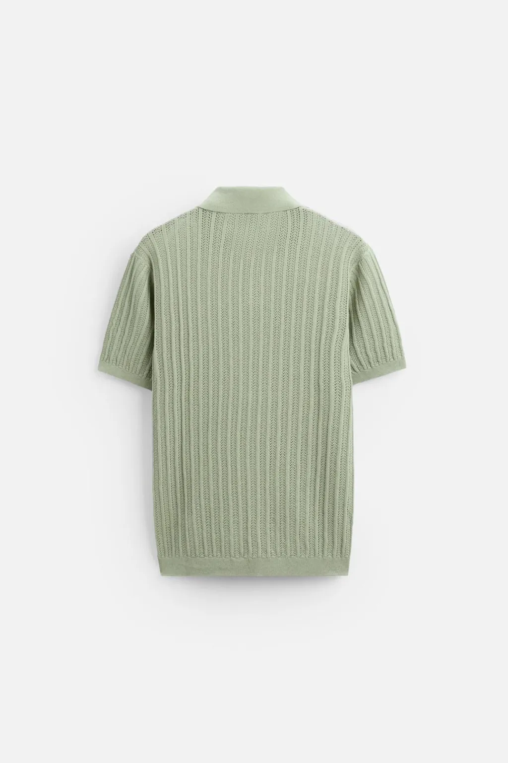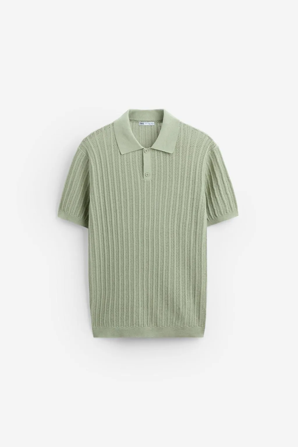 Polo de punto tejido con estructura abierto. Cuello solapa con cierre frontal de botonadura. Manga corta. Acabados en rib.