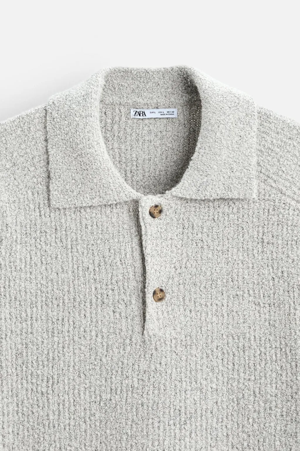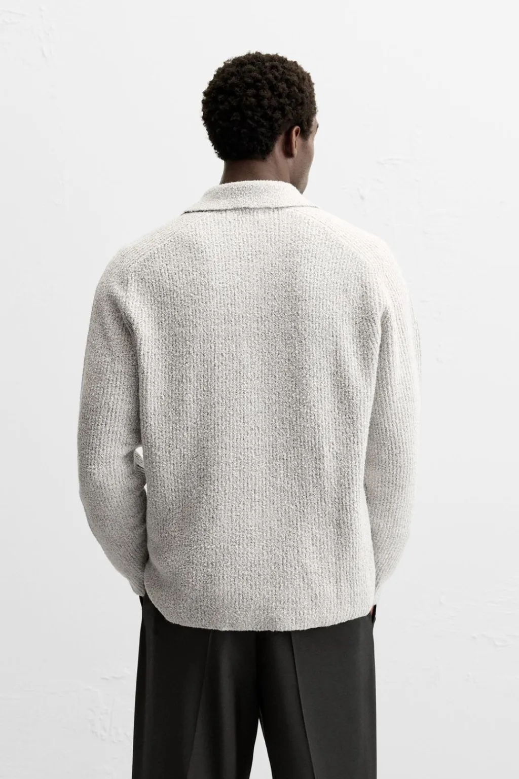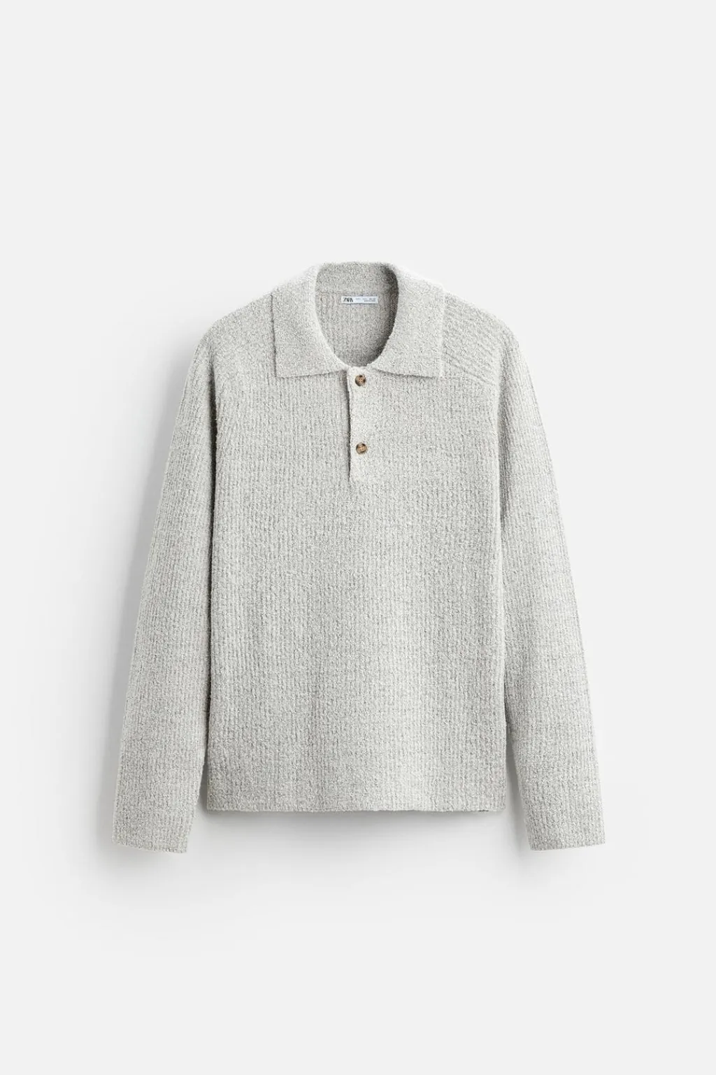 Polo regular fit tejido en hilatura con textura bouclé. Cuello solapa con cierre frontal de botonadura. Manga larga.