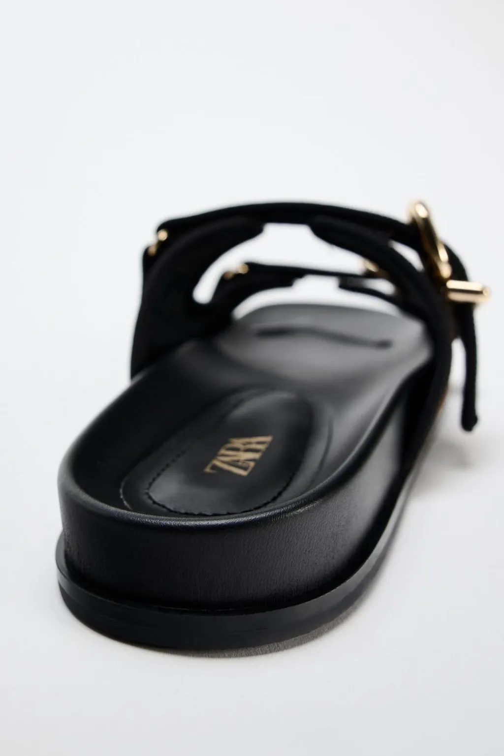 Zapato tipo sandalia plana de piel con pelo. Estampado animal. Detalle de tiras con hebilla en la parte delantera.