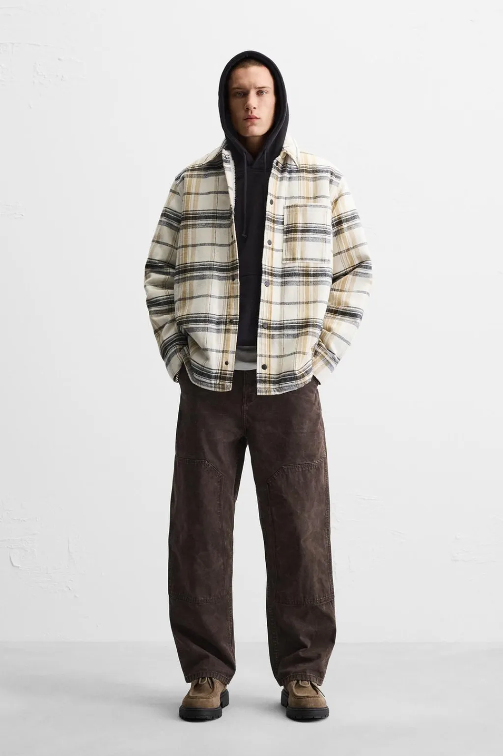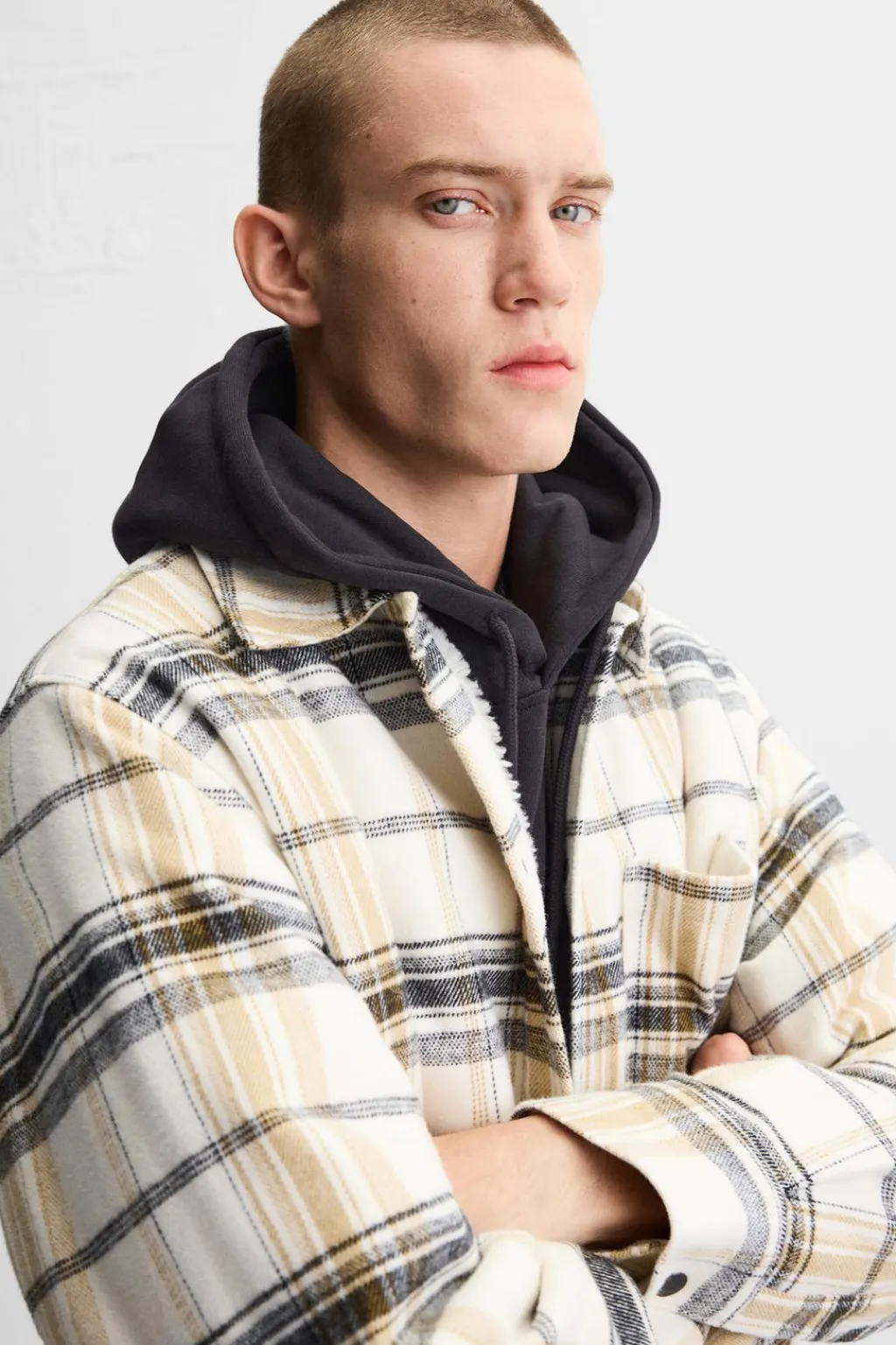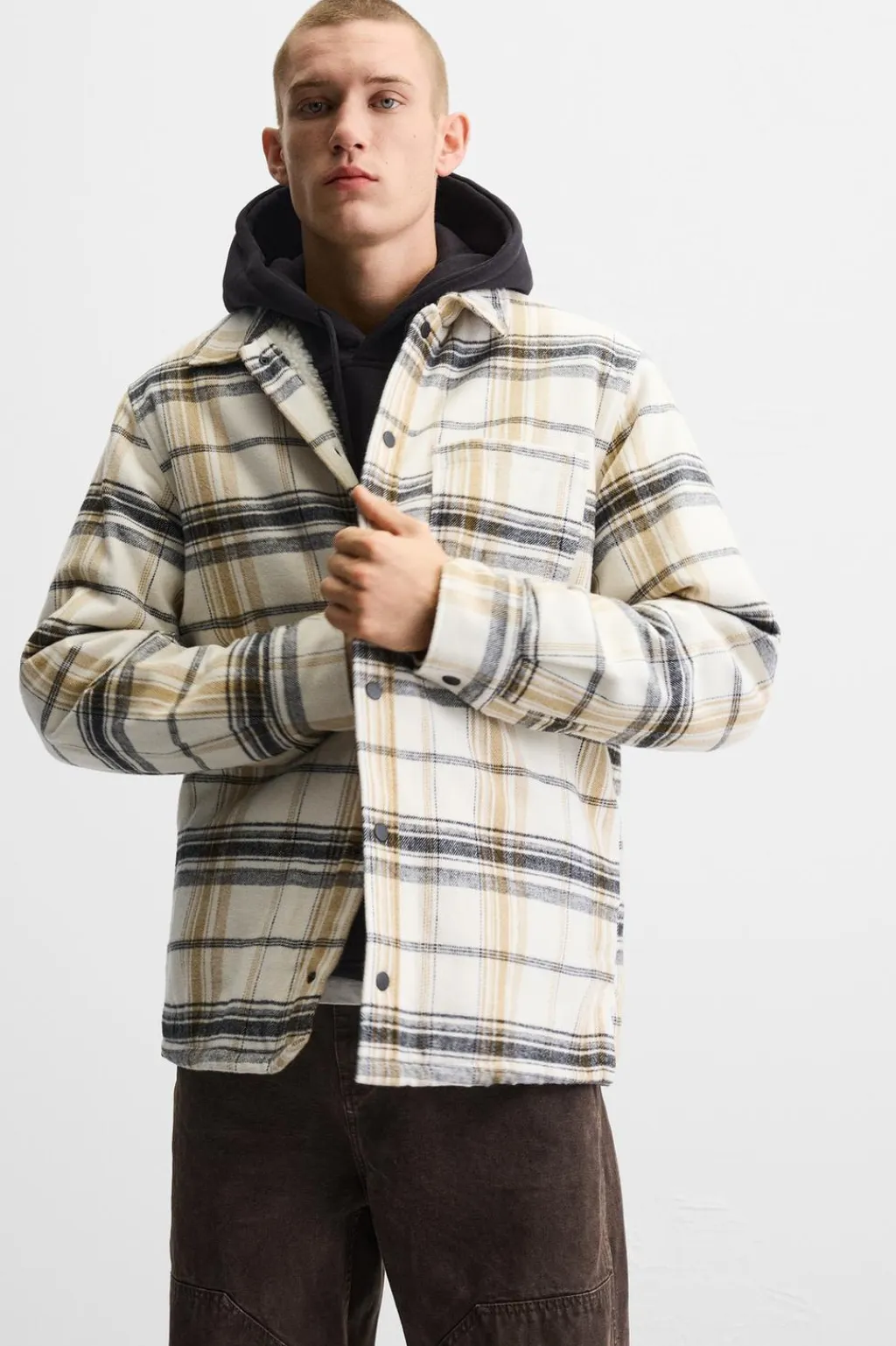 Sobrecamisa relaxed fit confeccionada en tejido de algodón con el interior en borreguillo. Cuello solapa y manga larga acabada en puño con botón. Detalle de bolsillo plastrón en pecho. Cierre frontal de botonadura.