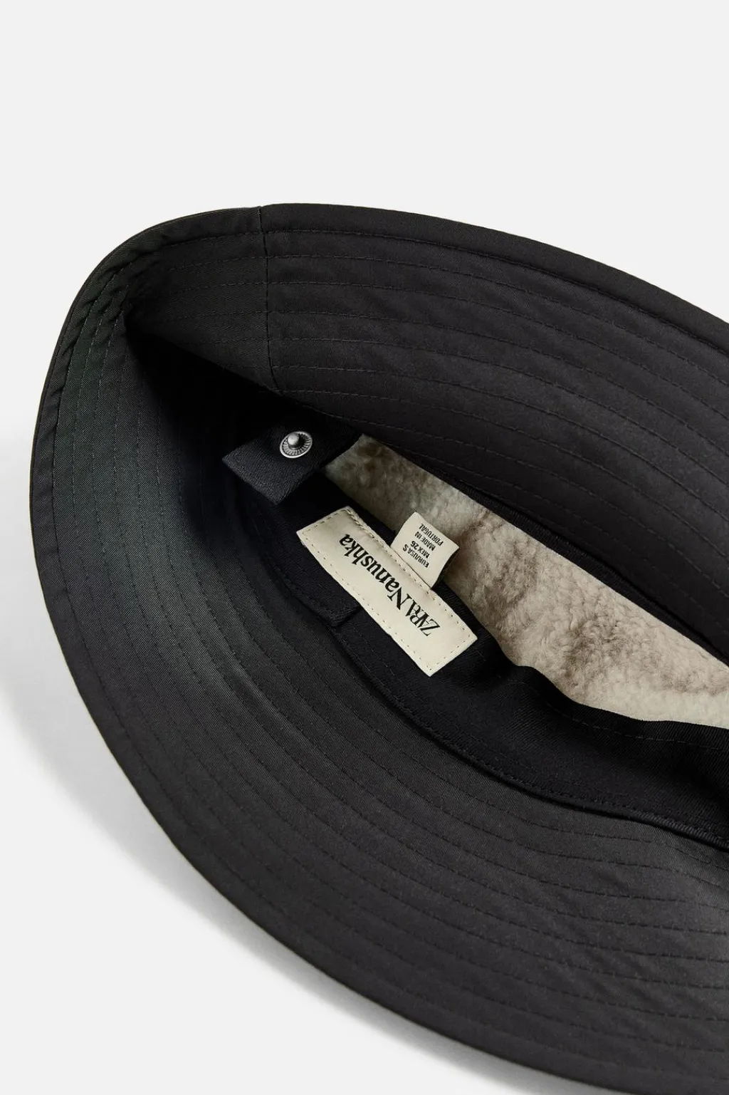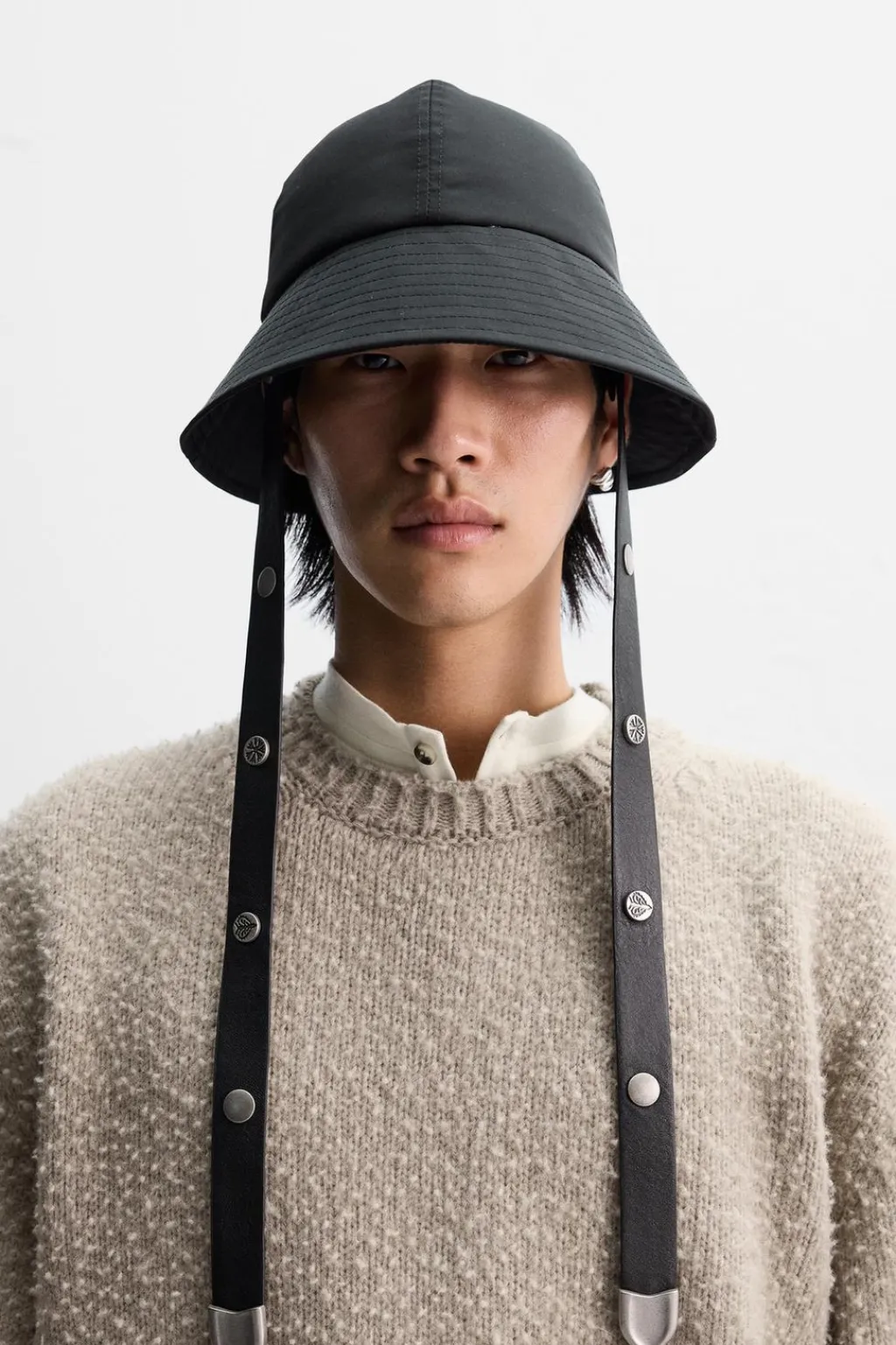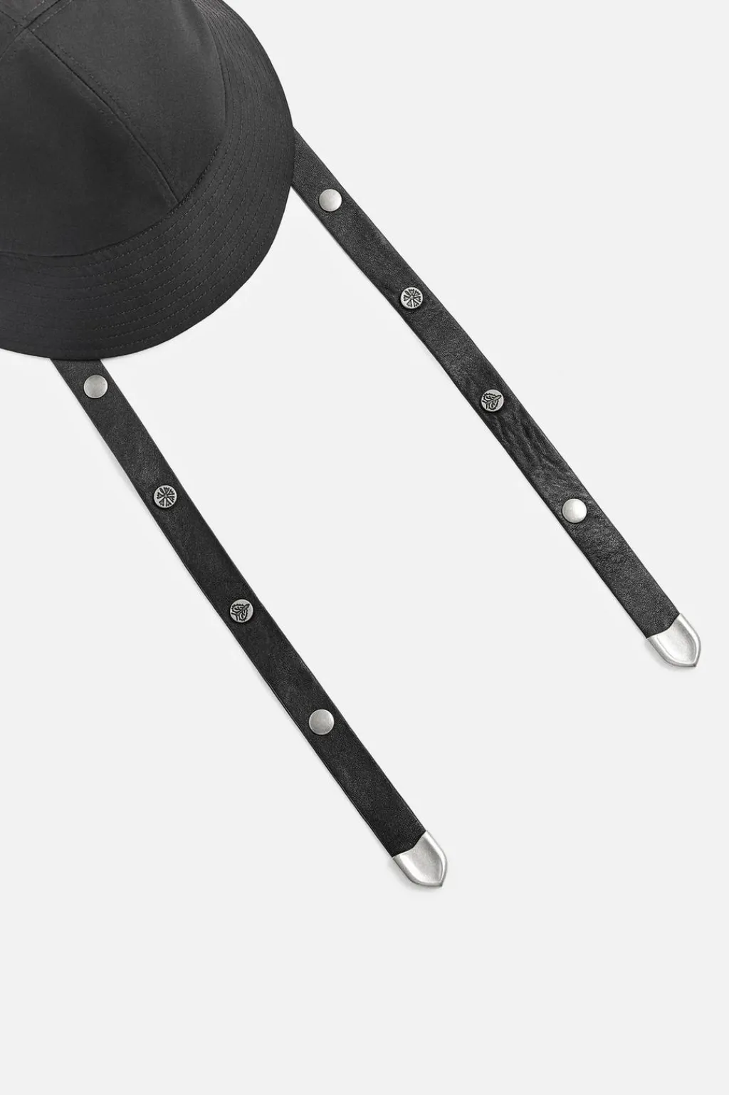 Sombrero bucket confeccionado en tejido técnico. Ala ancha. Ajustable con tiras de piel con apliques metálicos.