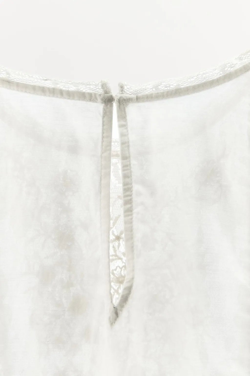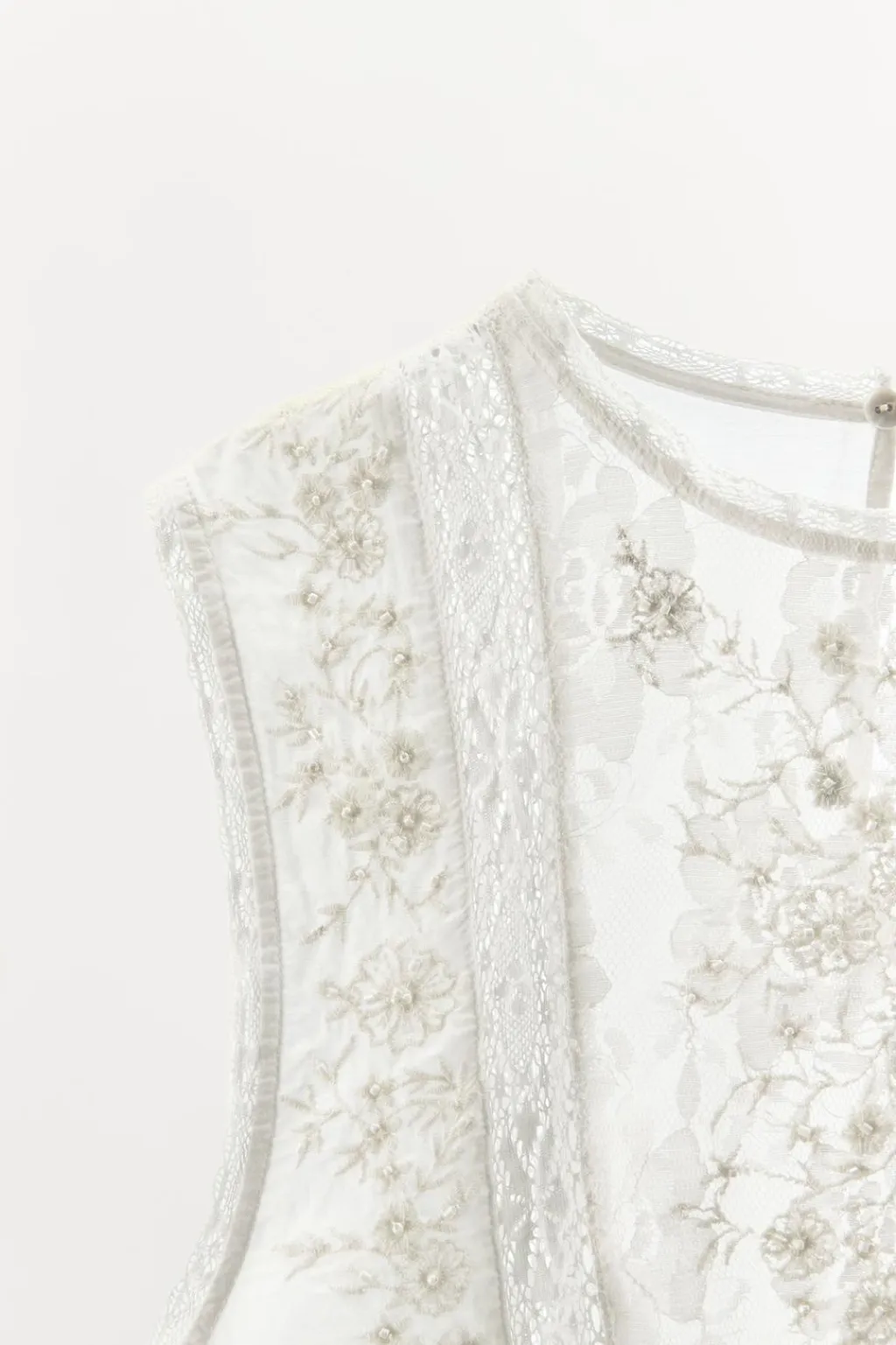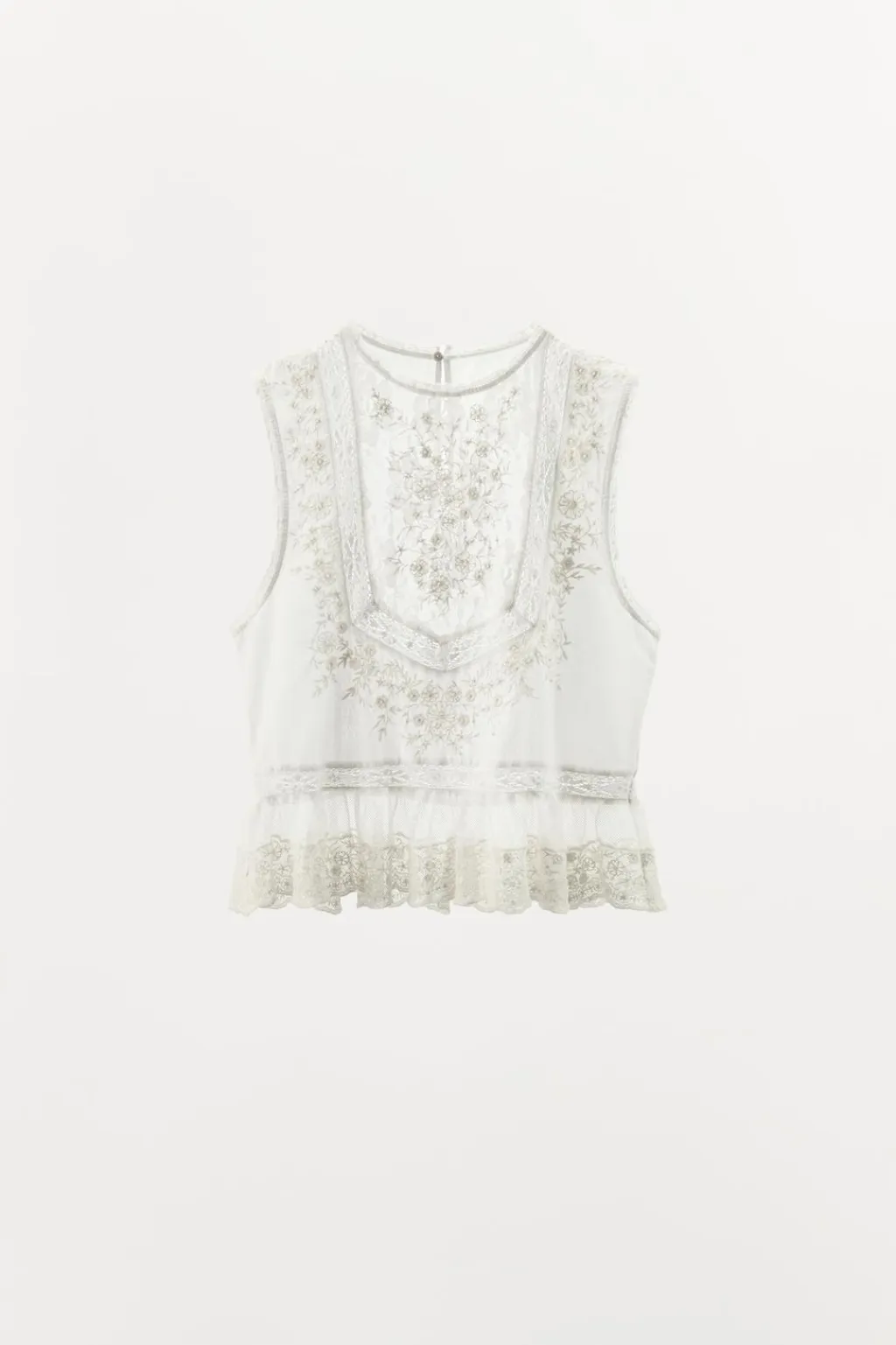 Top confeccionado en mezcla de viscosa. Cuello redondo y manga sisa. Detalle de bordados florales y aplicación de puntilla y abalorios combinados a tono. Bajo acabado en ondas. Cierre en espalda con botón oculto