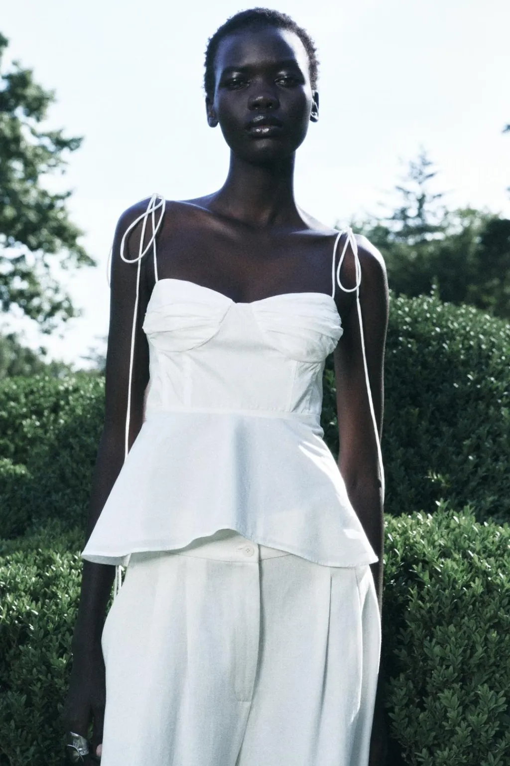 Top confeccionado en hilatura de algodón 100%. Escote corazón y tirantes finos ajustables con lazadas. Detalle de elástico tipo nido de abeja en espalda. Bajo asimétrico. Cierre lateral con cremallera oculta en costura.