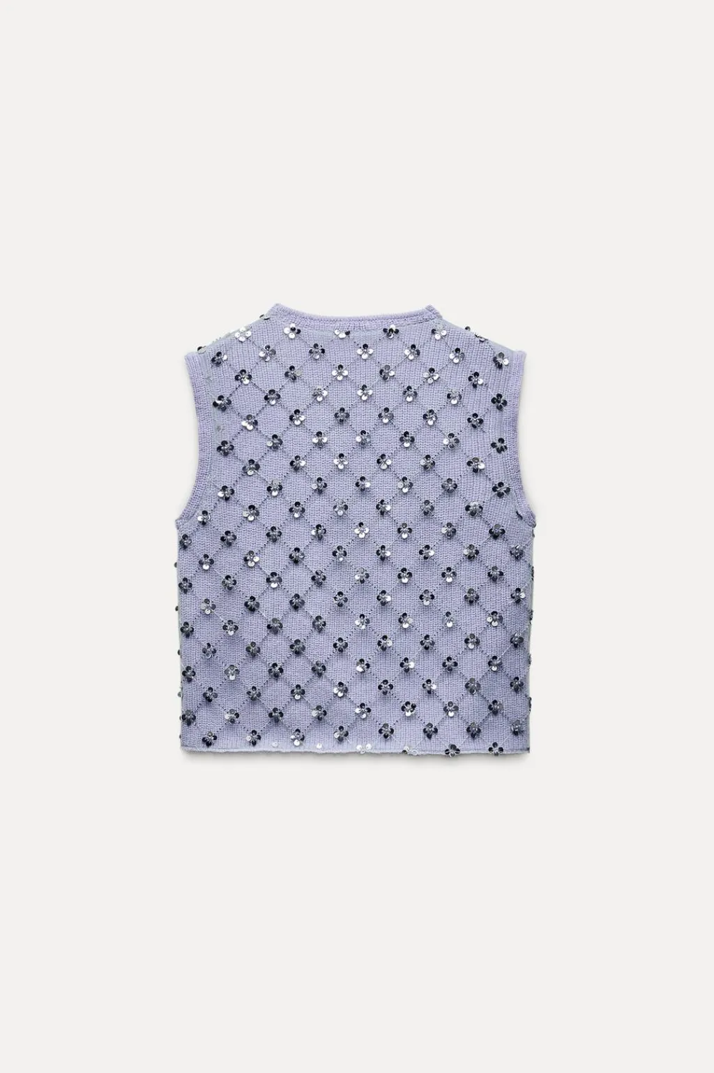 Top chaleco de escote pico y manga sisa. Tejido tipo tul combinado. Detalle aplicación de abalorios y lentejuelas a contraste. Cierre frontal con ganchos metálicos.