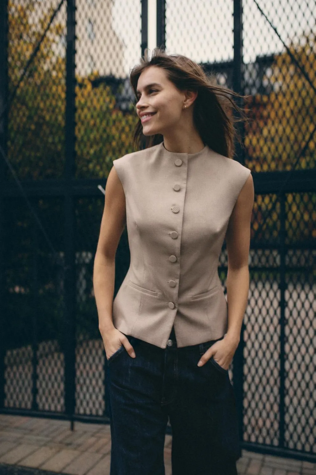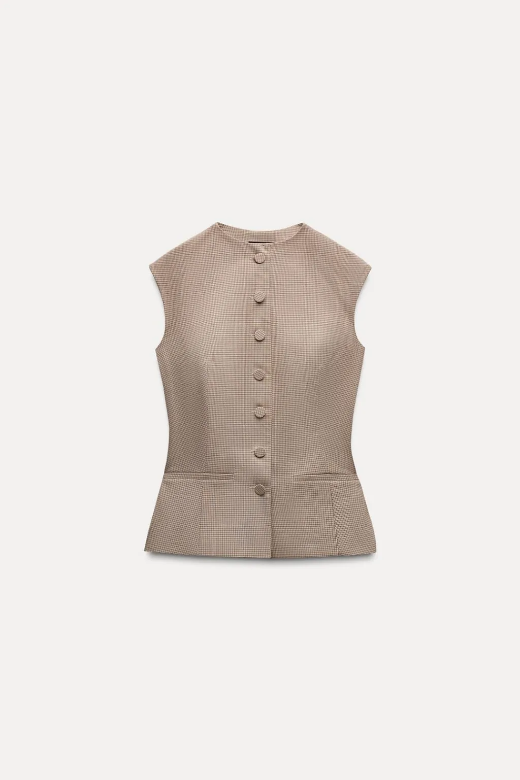 Top de cuello redondo y manga sisa. Falsos bolsillos de vivo en delantero. Forro interior combinado. Cierre frontal con botones forrados.