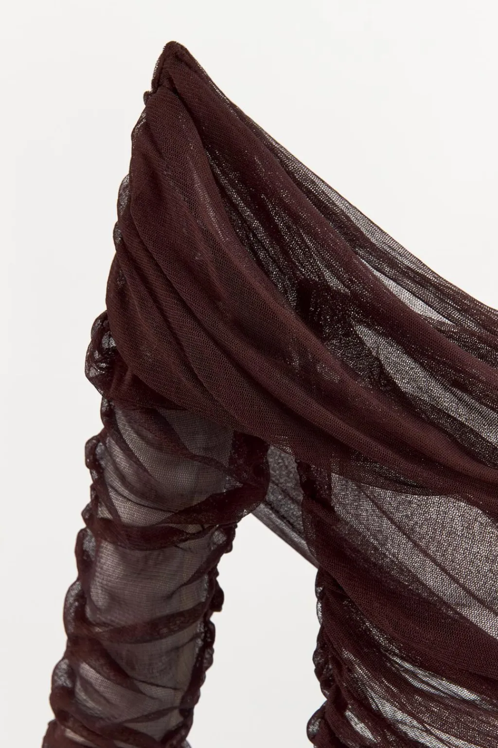 Top semitransparente confeccionado en hilatura de seda 100%. Escote pico cruzado y hombros descubiertos. Manga larga. Detalle de tejido drapeado y costura marcada.