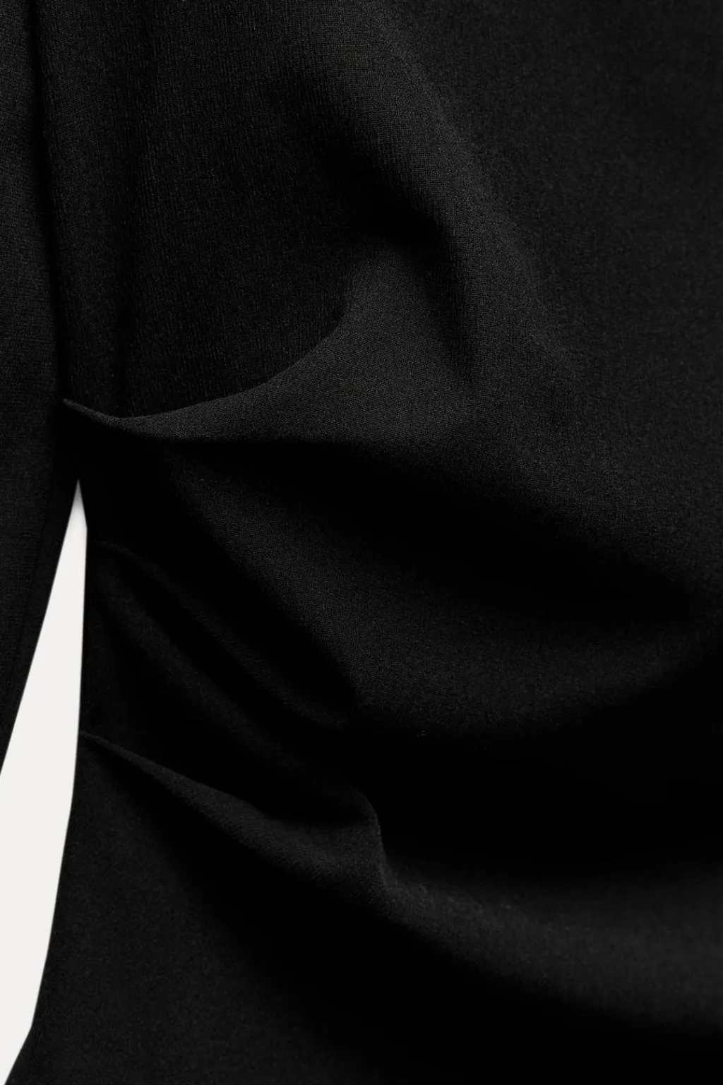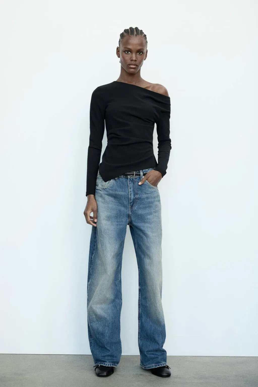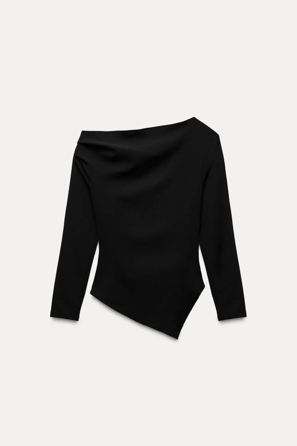 Top de escote asimétrico y manga larga con hombro descubierto. Detalle de frunces. Bajo acabado asimétrico.