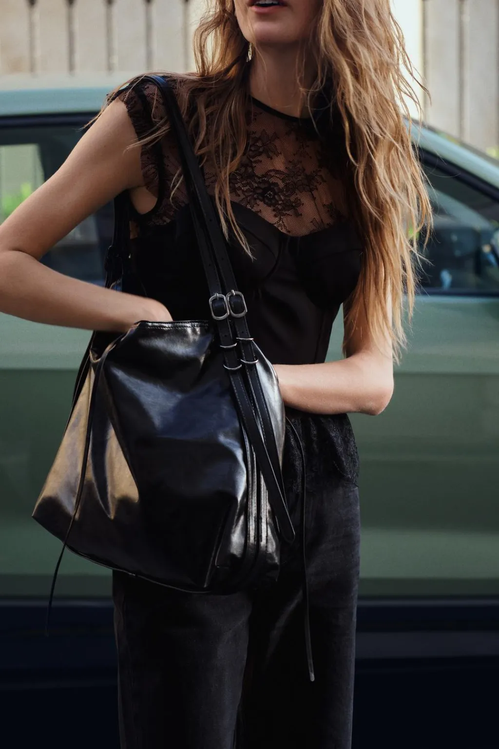 Top de encaje con cuello redondo y tejido combinado satinado. Detalle de aros en pecho y tirantes finos ajustables. Cierre lateral con cremallera oculta en costura.