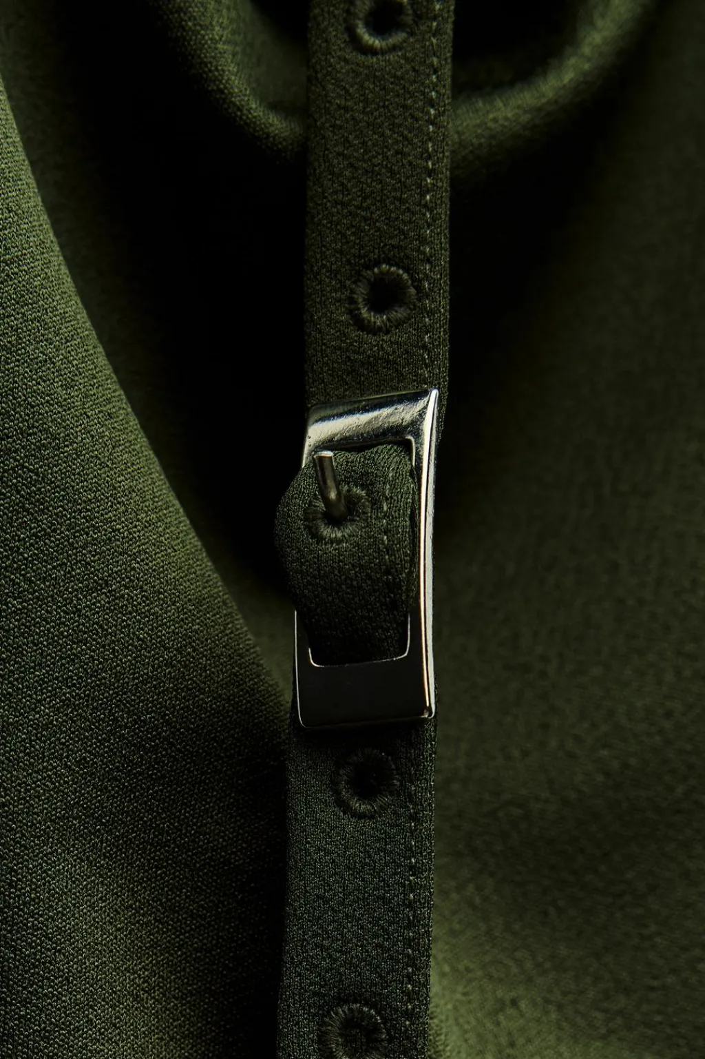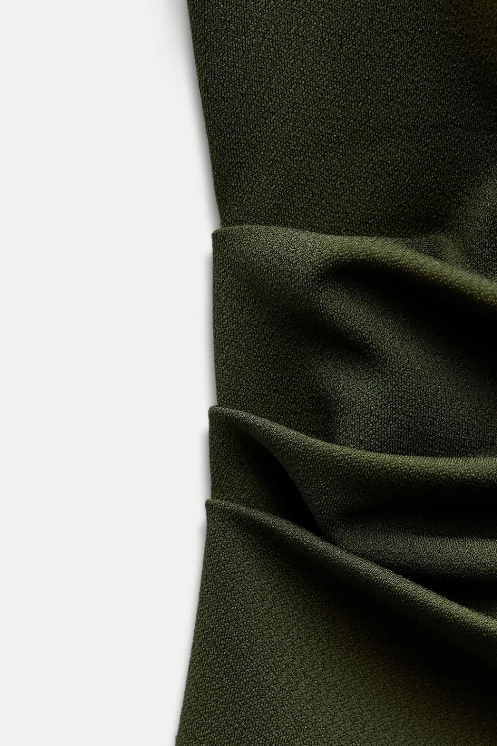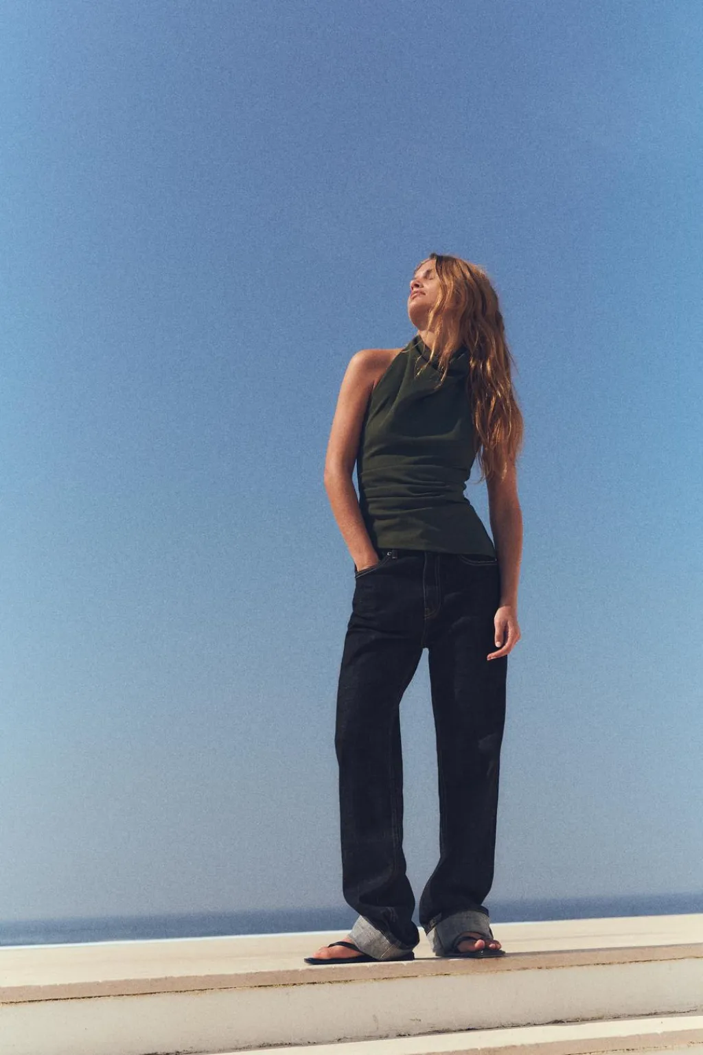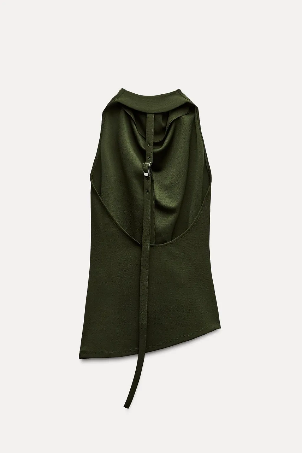 Top de cuello halter drapeado. Detalle de frunces laterales. Tira en espalda con hebilla metálica. Bajo acabado asimétrico.