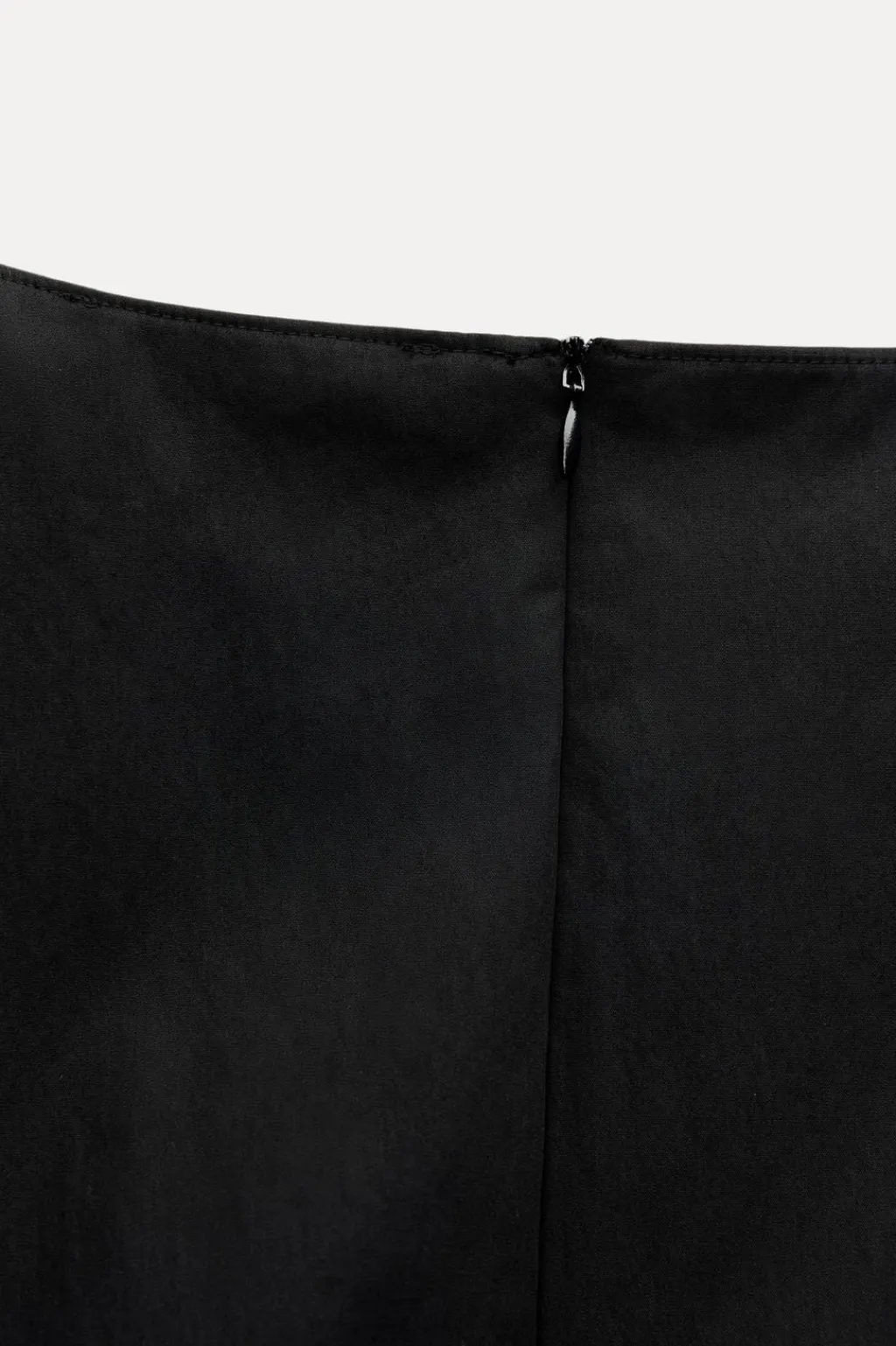 Top confeccionado en hilatura con mezcla de algodón. Cuello barco y manga sisa. Bajo acabado en peplum. Cierre en espalda con cremallera oculta en costura.