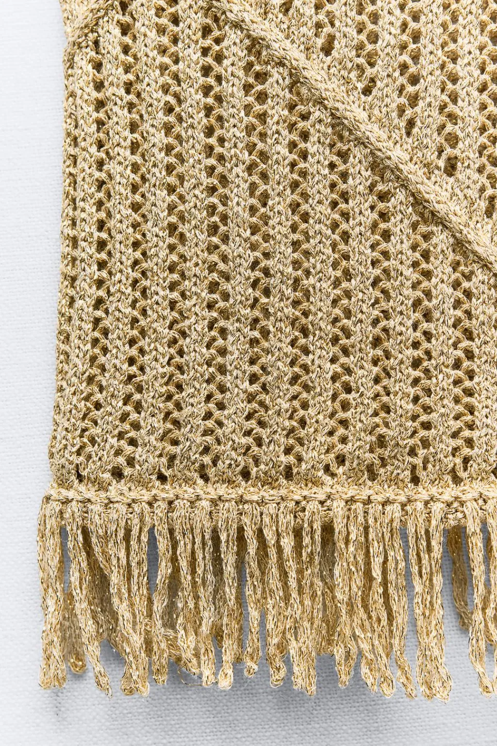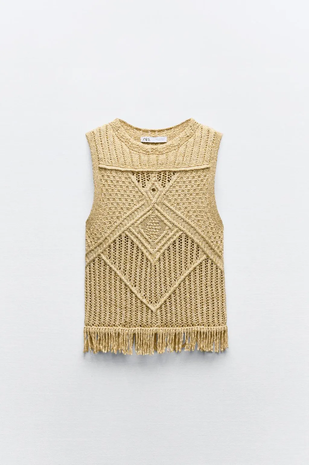 Top de cuello redondo y manga sisa. Bajo acabado con flecos. Detalle de hilo metalizado.