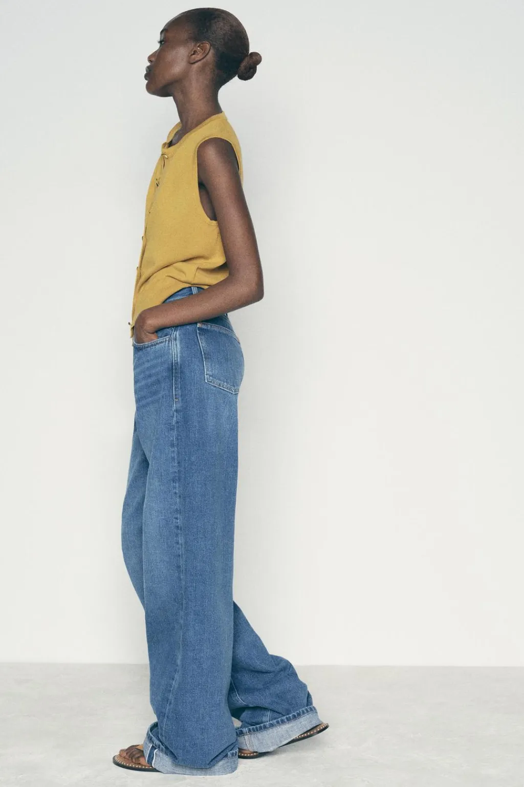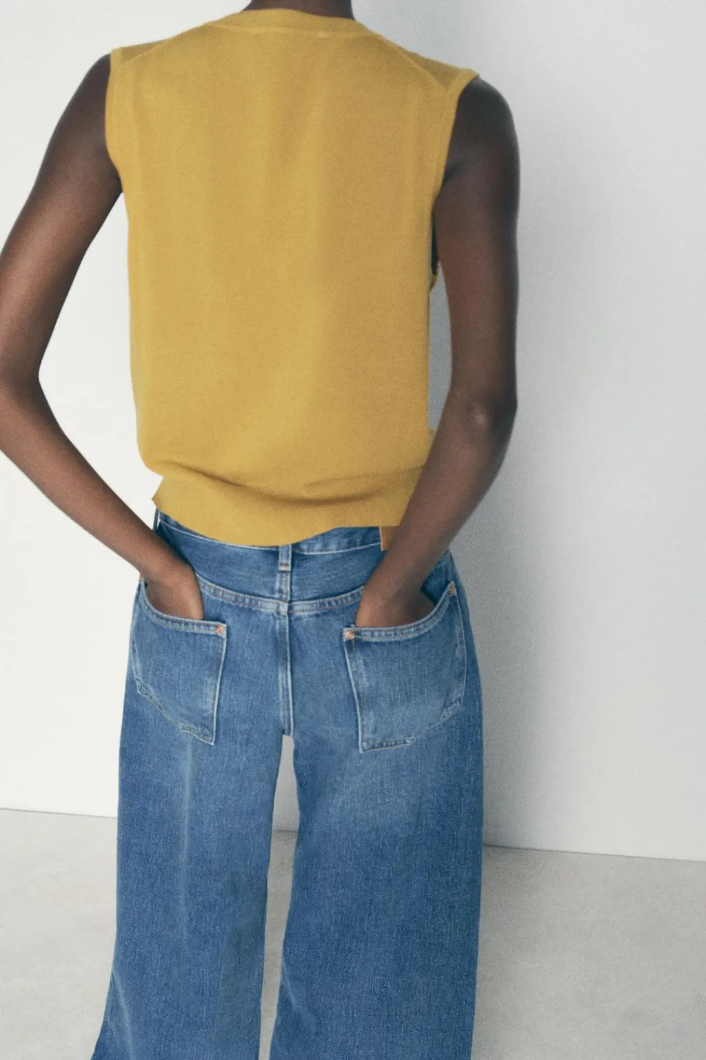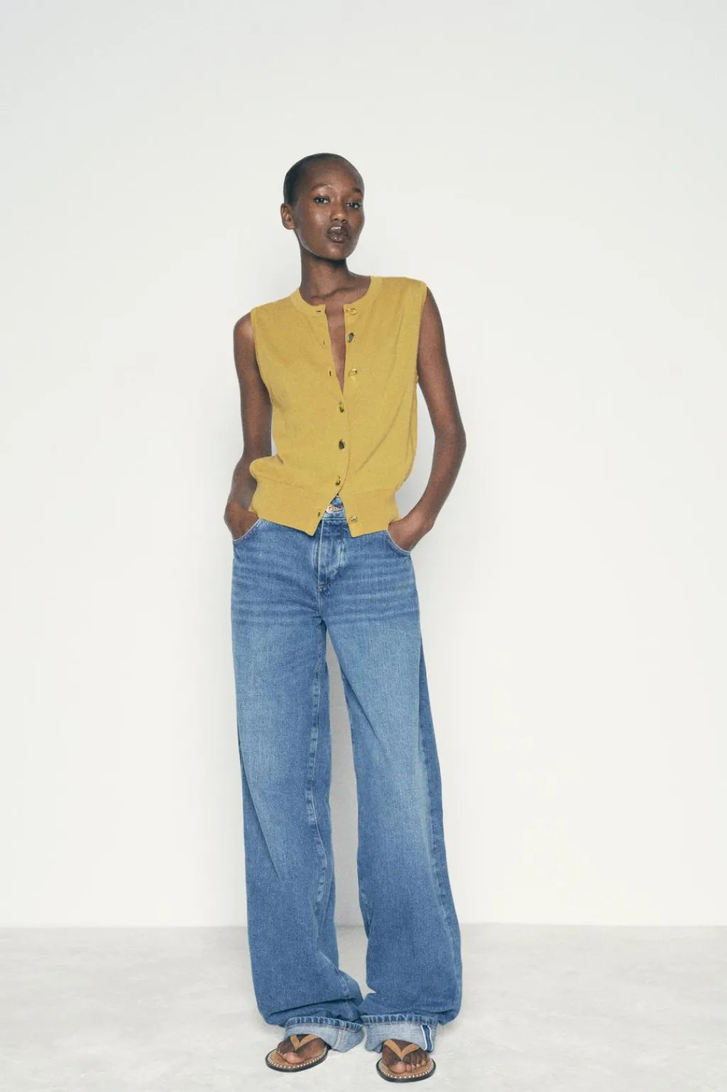 Top de cuello redondo y manga sisa. Acabados en rib. Cierre frontal con botones dorados.