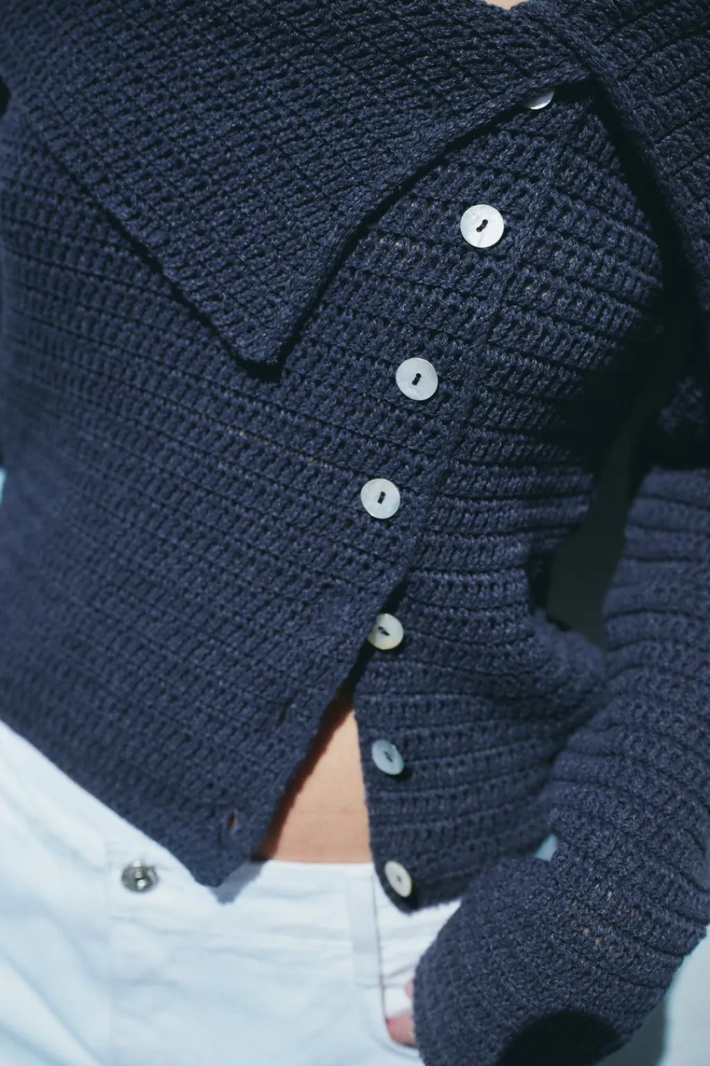 Top de cuello con solapa amplia y manga larga. Cierre frontal cruzado con botones.