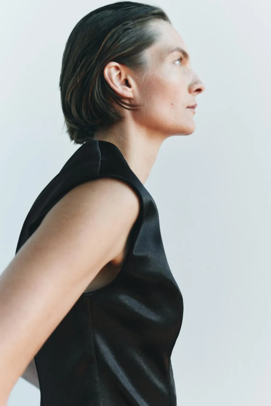 Top satinado de cuello redondo y manga sisa.