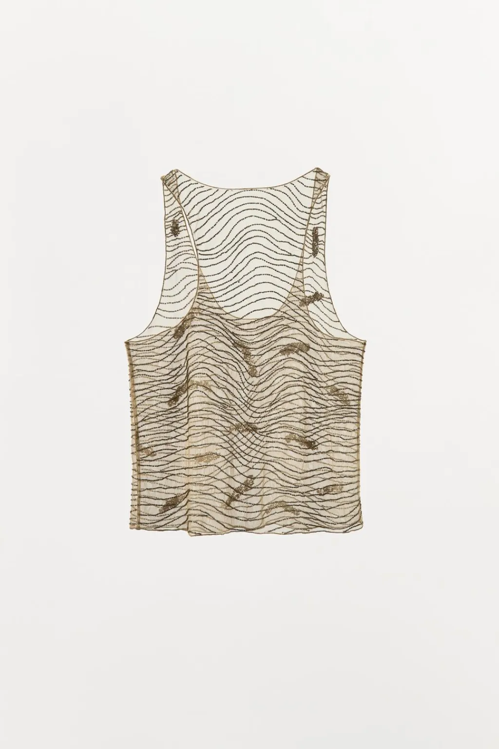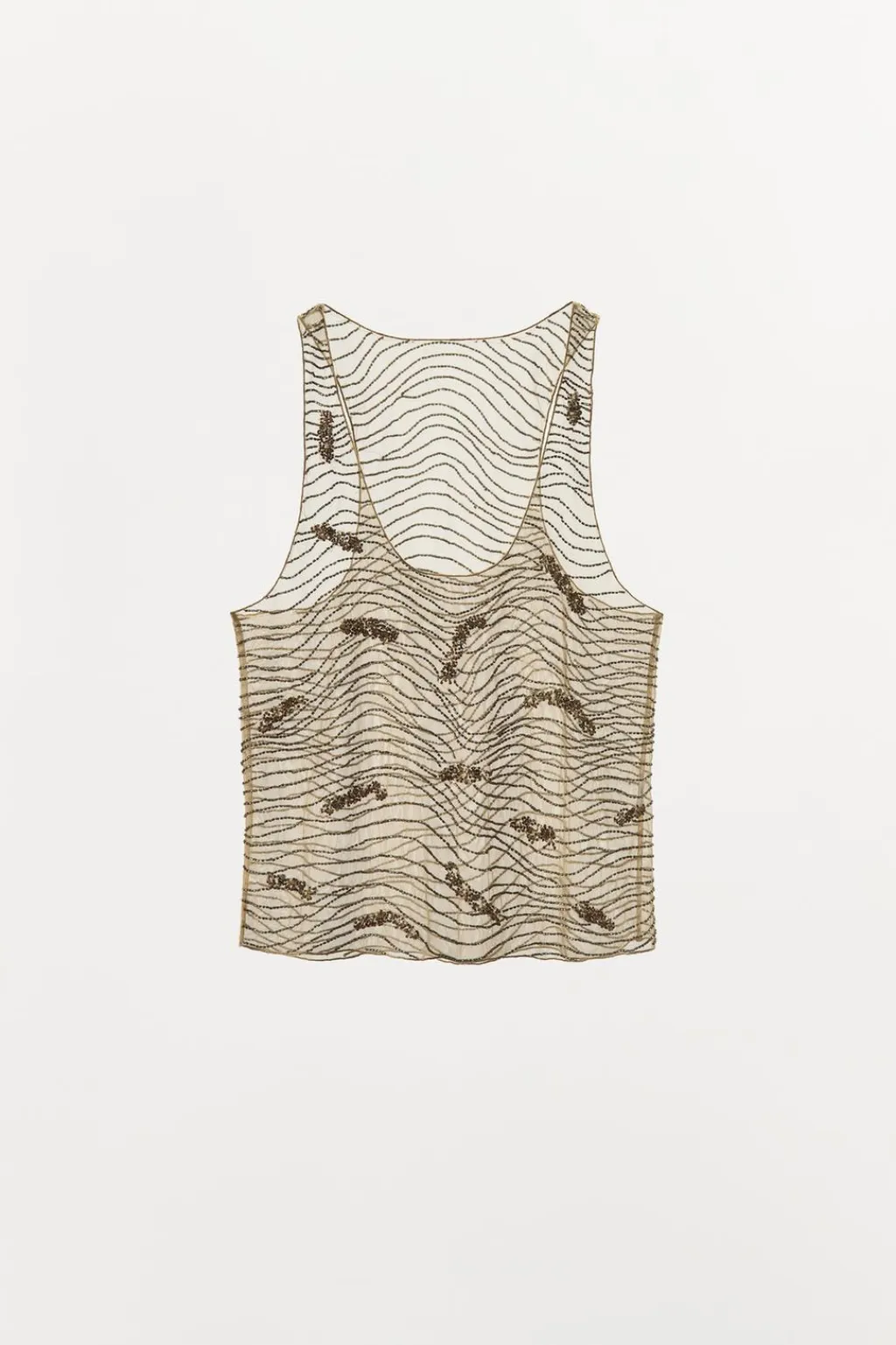 Top semitransparente de escote redondo y tirantes. Detalle de bordados y aplicación de abalorios en diferentes formas y tamañoos combinados a contraste.